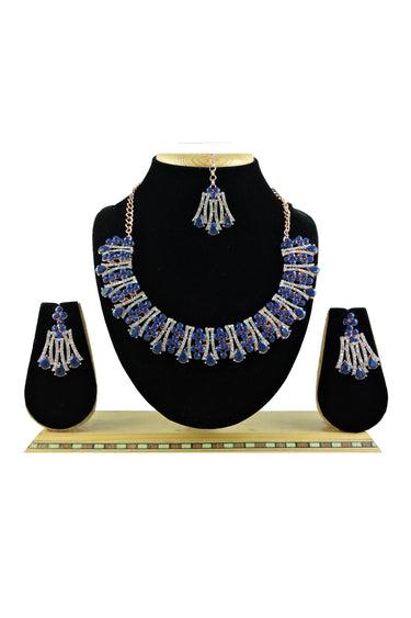 Navy Blue Color Alloy Material Embellished Necklace With Earrings and Mang Tikka