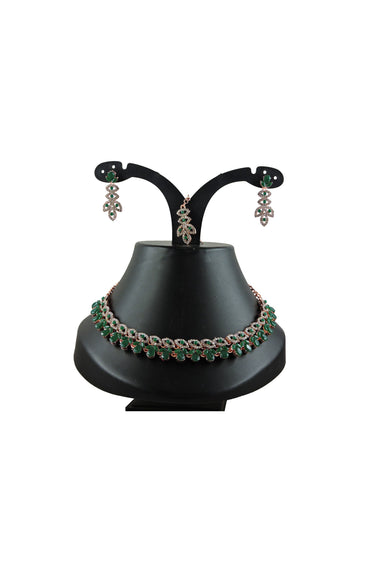 Green Color Stylish Alloy Necklace With Earrings and Mang Tikka