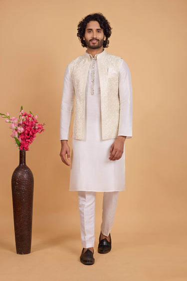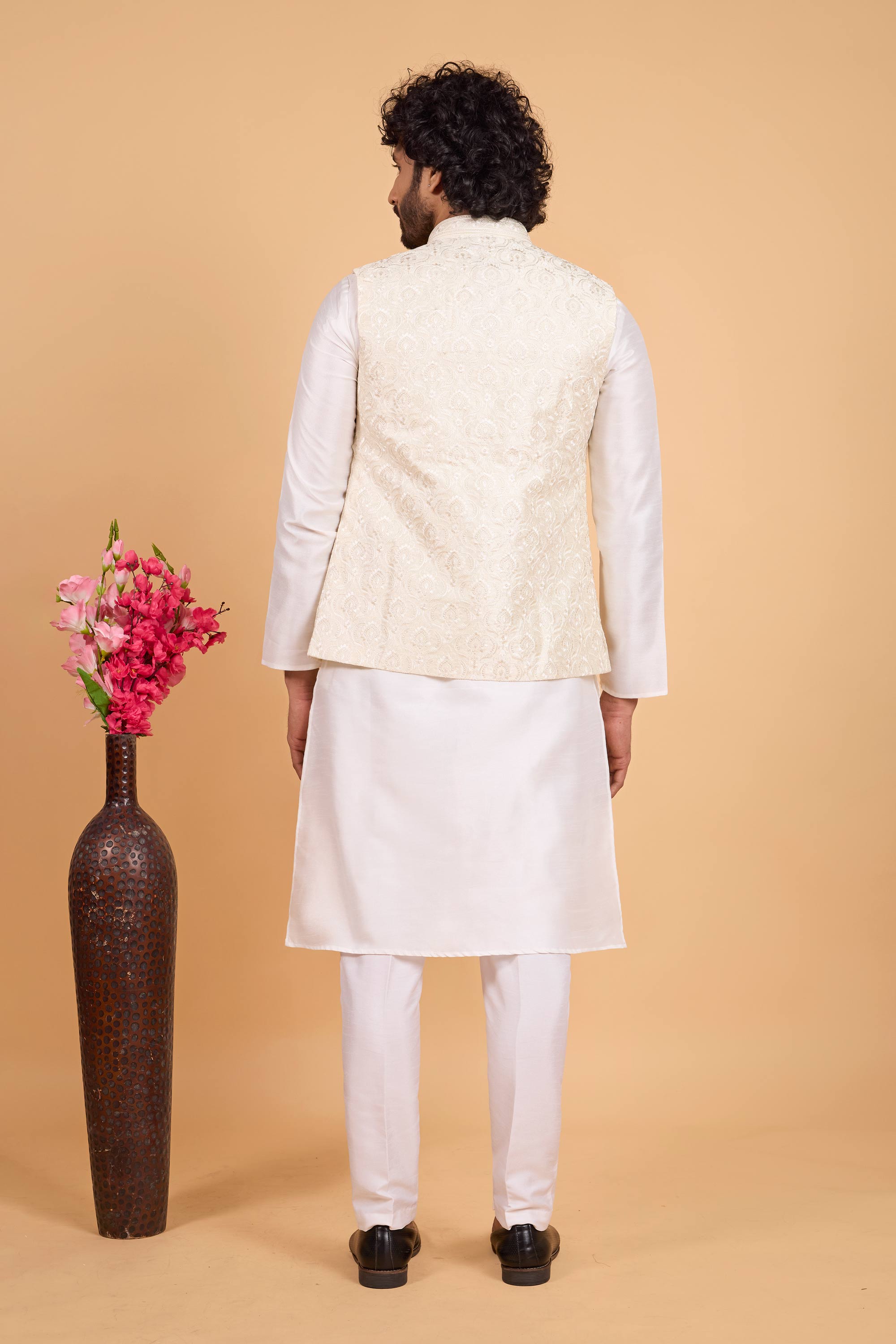 Art Silk Off White Readymade Kurta And Aligadhi Pant With Embroidered Jacket For Men