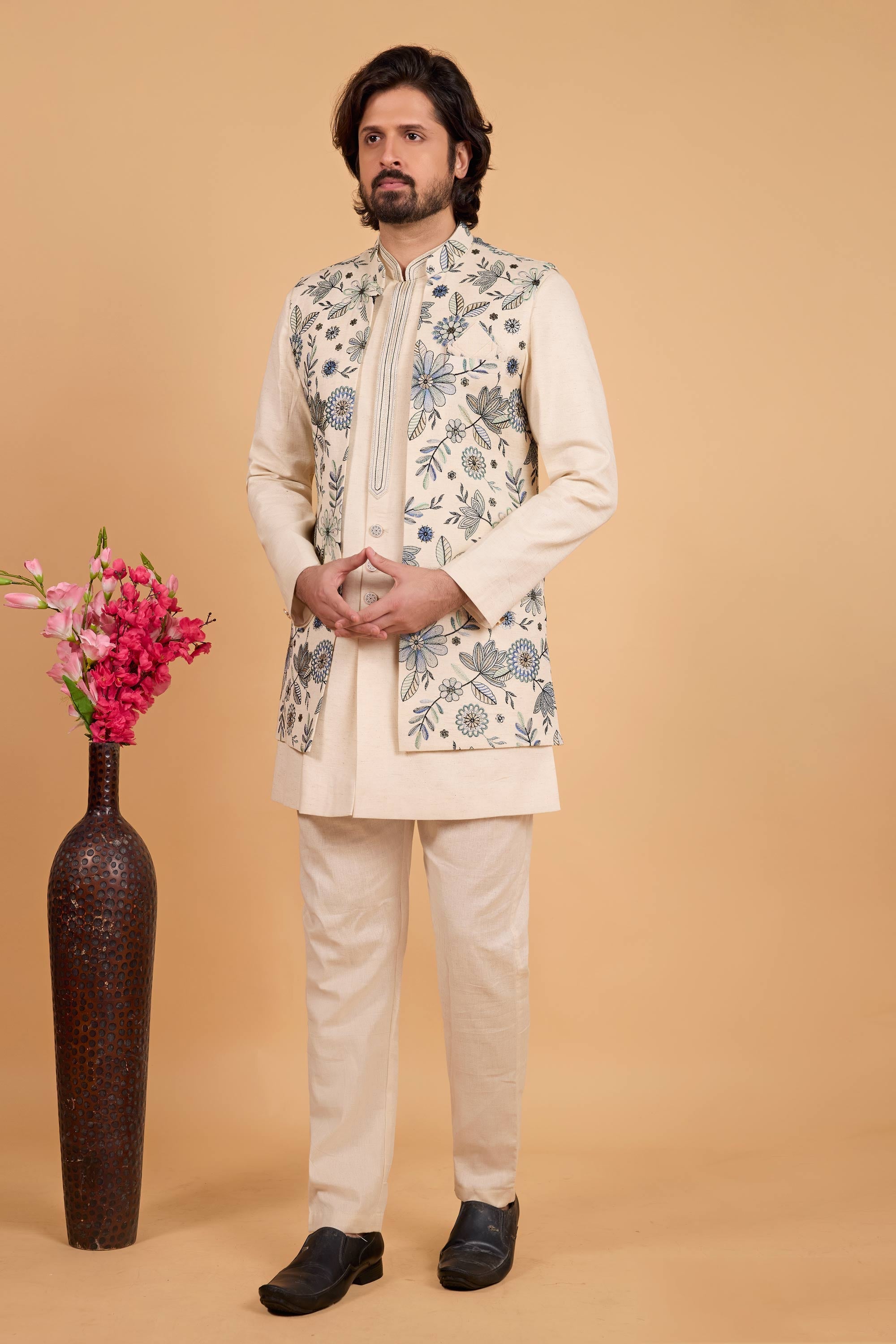 Beige Art Silk Readymade Kurta And Aligadhi Pant With Embroidered Jacket For Men