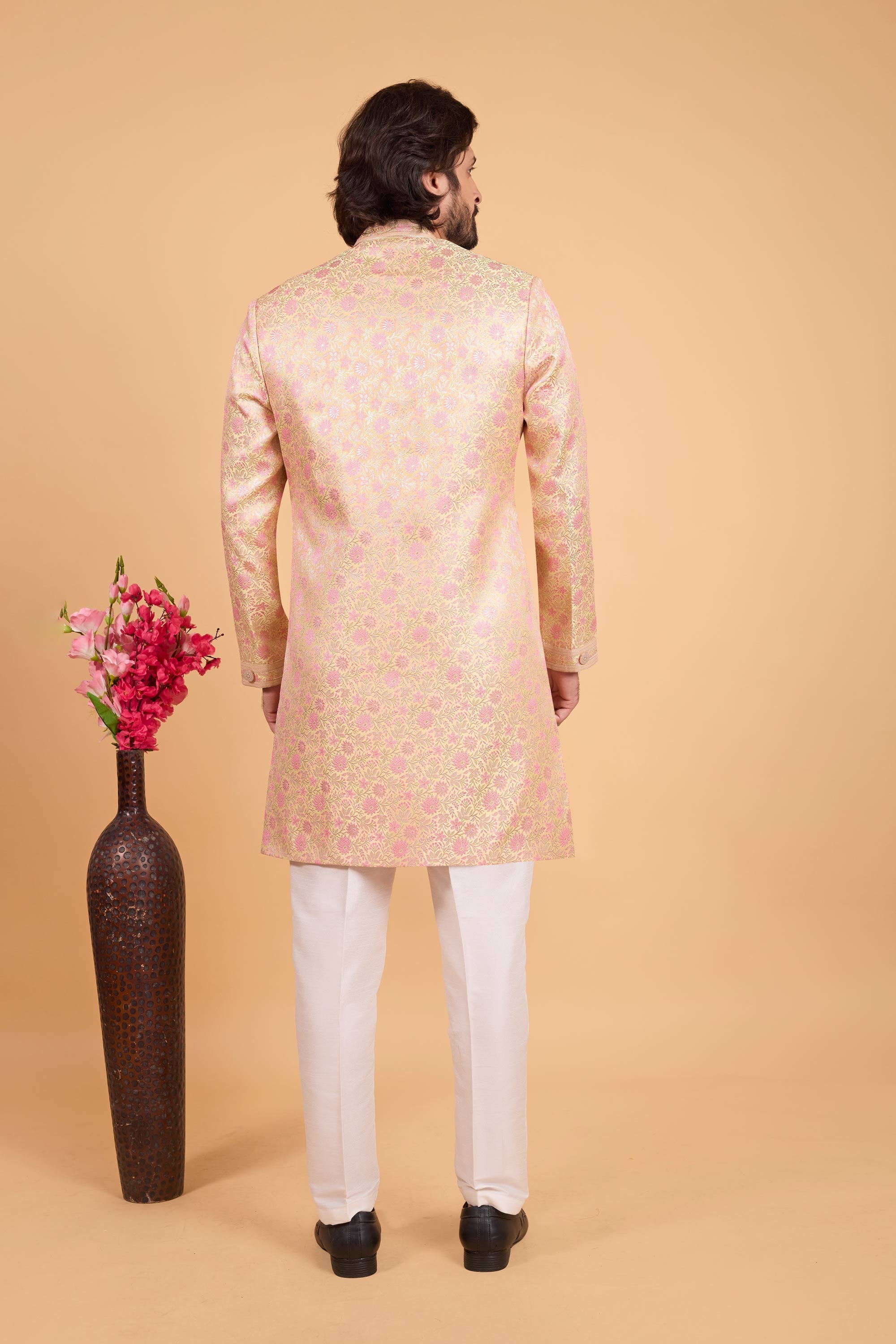 Cream Wedding Wear Zari Weaving Work Design Readymade Indowestern And Aligadhi Pant For Men