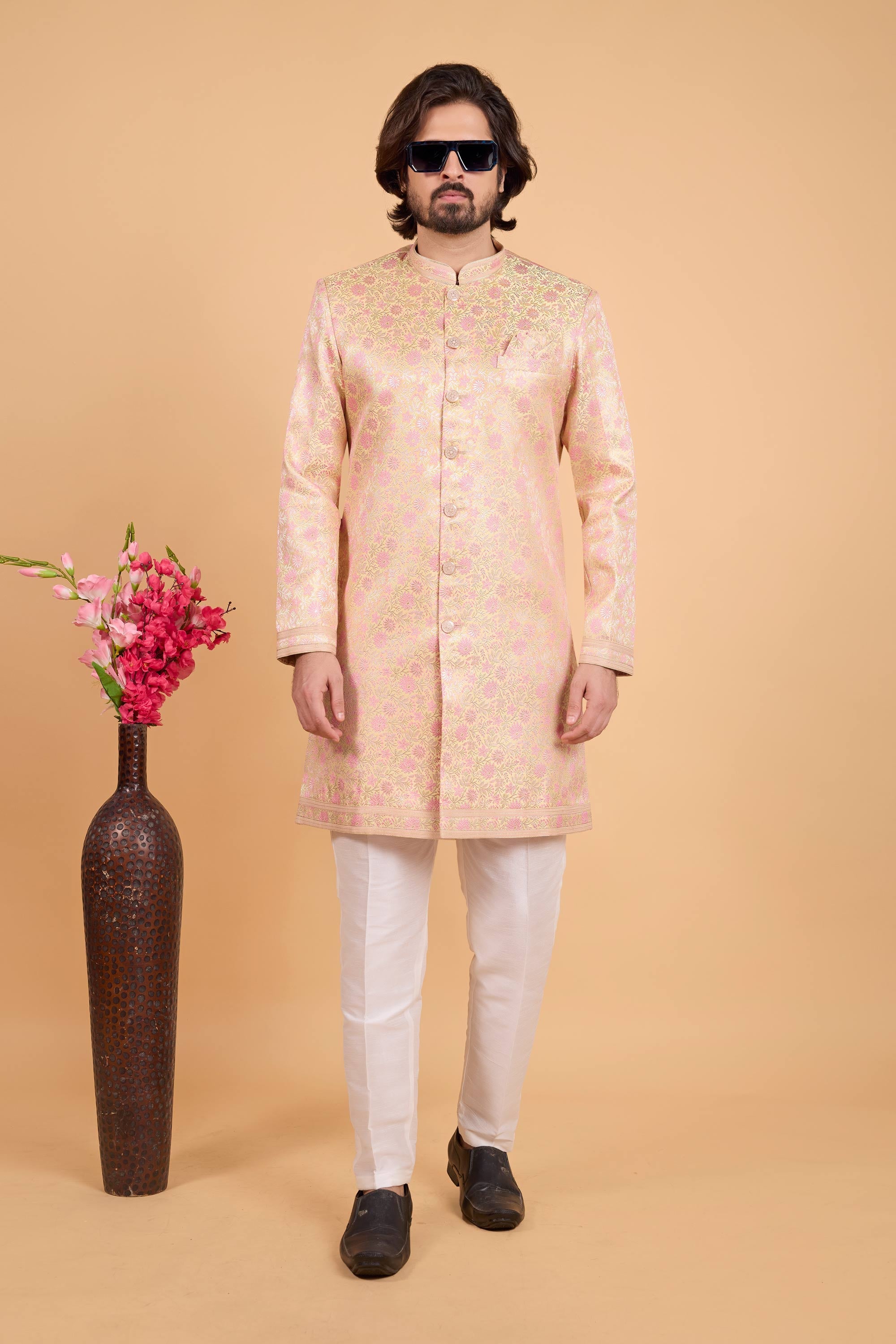 Step into sophistication with the Beautiful Reach Color Wedding Function Zari Weaving Work Design Readymade Indowestern and Aligadhi Pant. This stunning ensemble boasts intricate zari weaving that adds a touch of grace to its design. Featuring an effortless readymade fit, the combination of Indowestern flair with traditional Aligadhi pant creates an unforgettable look. Perfect for weddings, festive functions, and traditional events, this outfit offers a flawless blend of style and practicality. The fine craftsmanship ensures both durability and all-day comfort, making it the ideal choice for any celebratory moment. Upgrade your ethnic wear collection today.