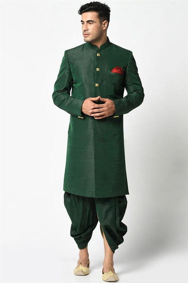 Dark Green Color Art Silk Fabric Sangeet Wear Designer Readymade Dhoti Style Indo Western For Men