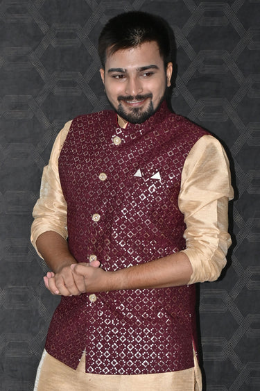 Maroon Color Art Silk Fabric Sangeet Wear Readymade Trendy Jacket For Men