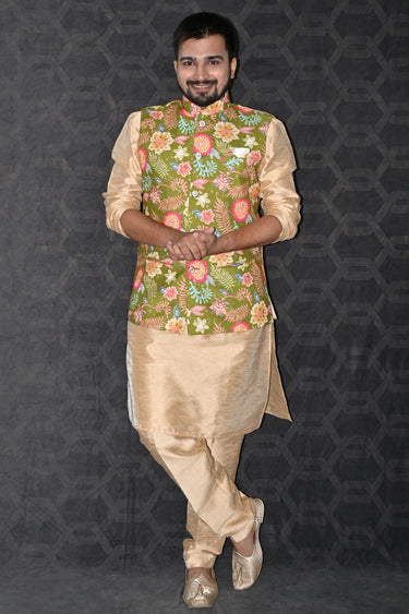 Dazzle at your next reception with our Elegant Men's Kurta Pyjama Set with Jacket. The set is beautifully crafted in a Golden hue from high-quality Art Silk fabric. It's not just readymade but fashionably designed to highlight your persona. A 3-piece set to provide a grand, celebratory feel. Let the fabric's softness and vibrant colour add a royal touch to your celebration.