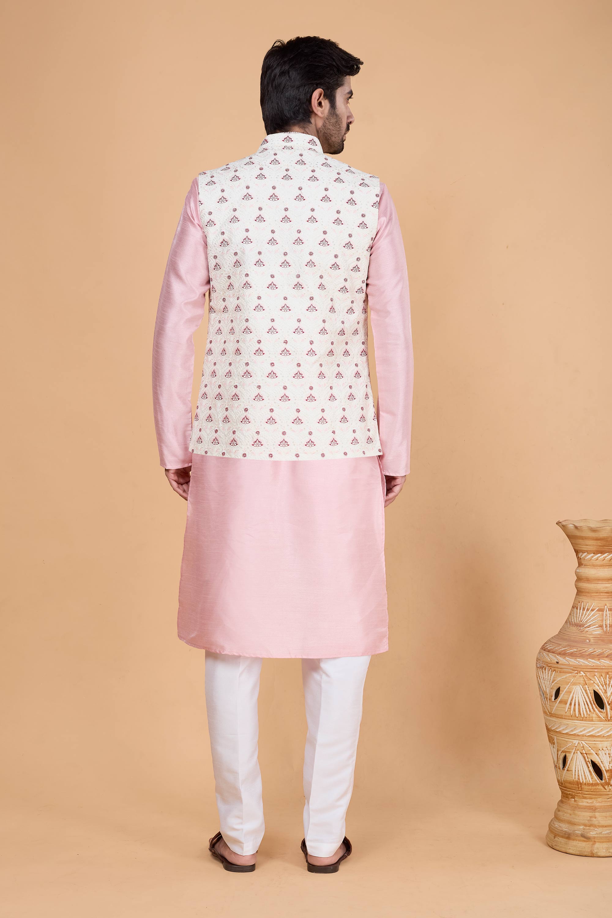 Pink Wedding Wear Art Silk Men Readymade Kurta And Aligadhi Pant With 3 Pcs Jacket Set