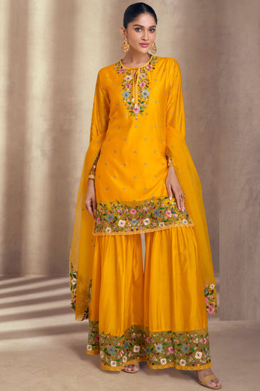 Sushrii Mishraa Yellow Color Art Silk Fabric Tempting Function Look Sharara Suit
