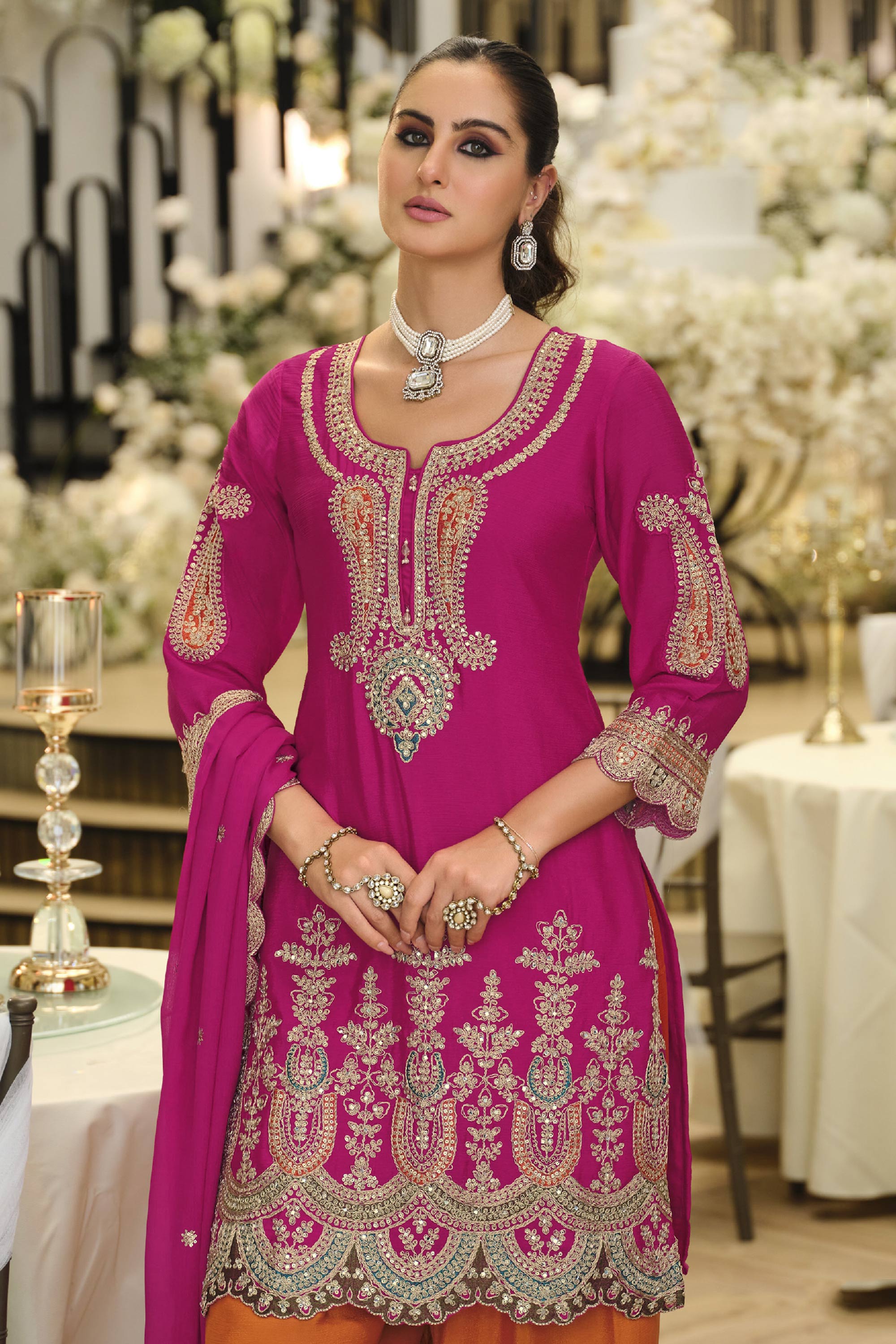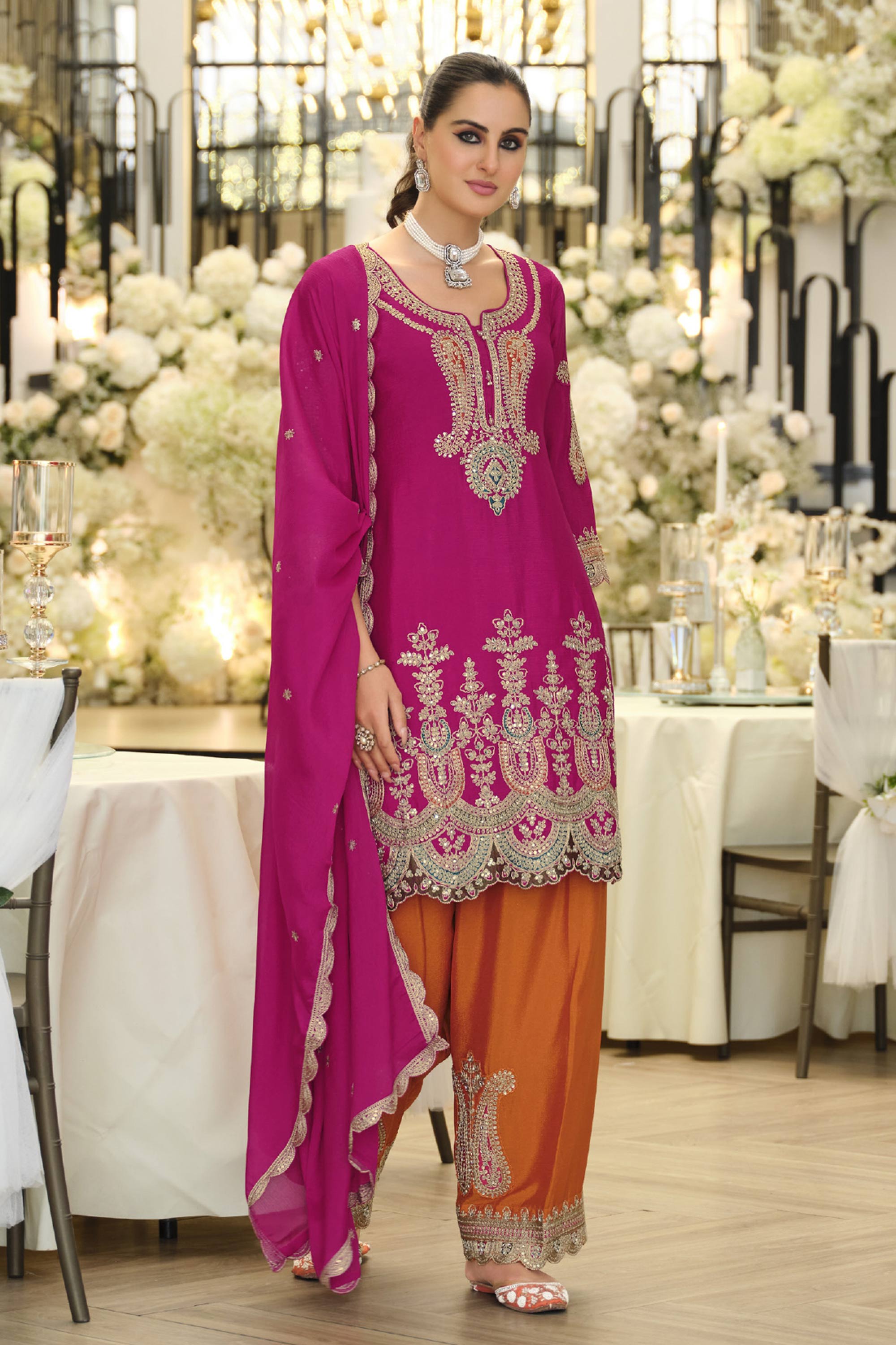 Step into effortless elegance with this beautifully crafted Salwar Kameez Palazzo Suit, designed to elevate your festive and special-occasion wardrobe. The outfit features a finely tailored Chinon top adorned with graceful embroidery work, giving it a rich and sophisticated appeal. Paired with a matching Chinon palazzo, it ensures a flowy silhouette and all-day comfort. Note: Due to digital photography, slight color variations may occur.