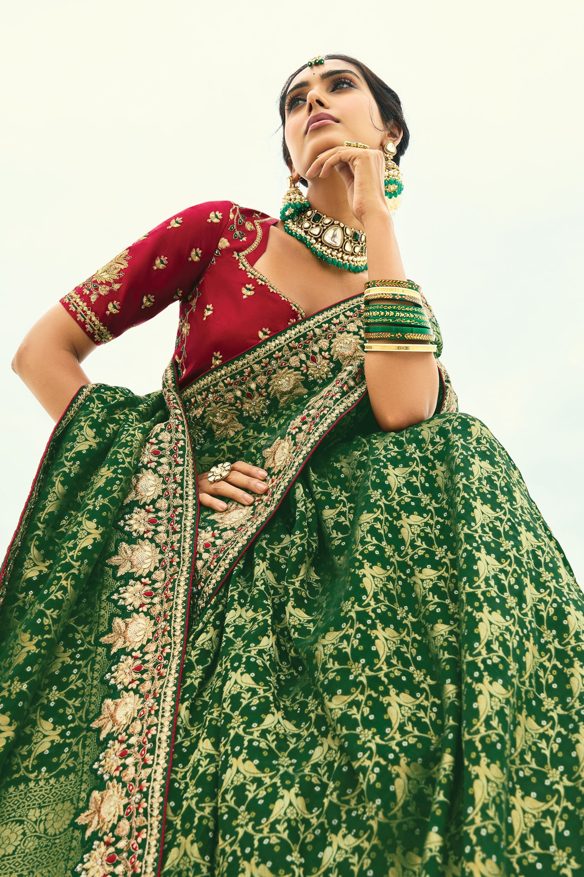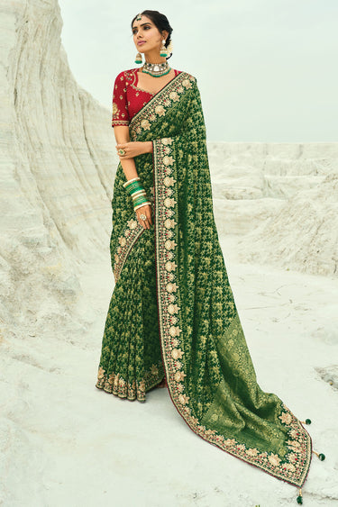 Festive Wear Green Bandhani Saree With Heavy Moti Border In Georgette