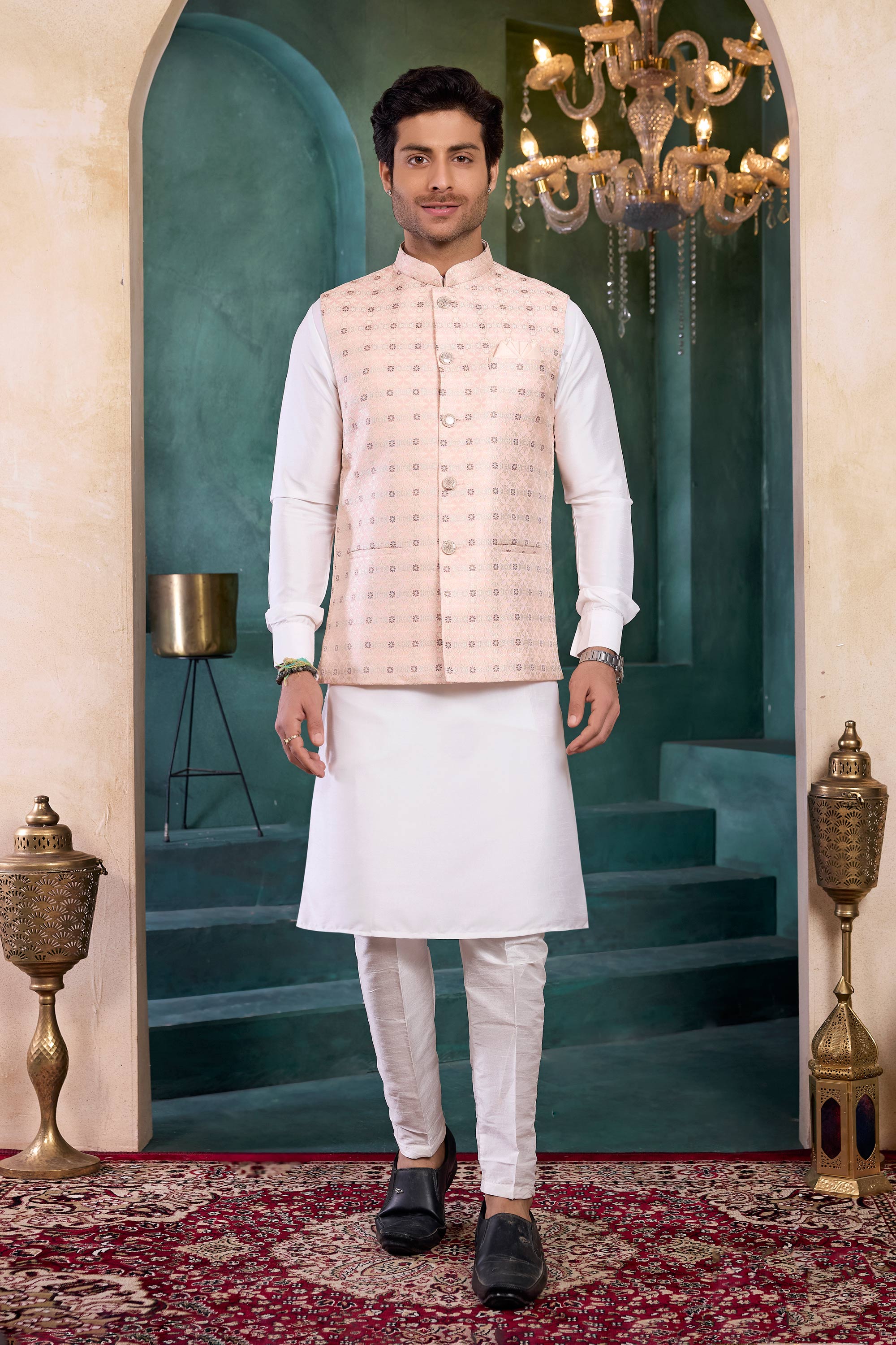 Jacquard Off White Men Readymade Kurta And Aligadhi Pant For Wedding Wear