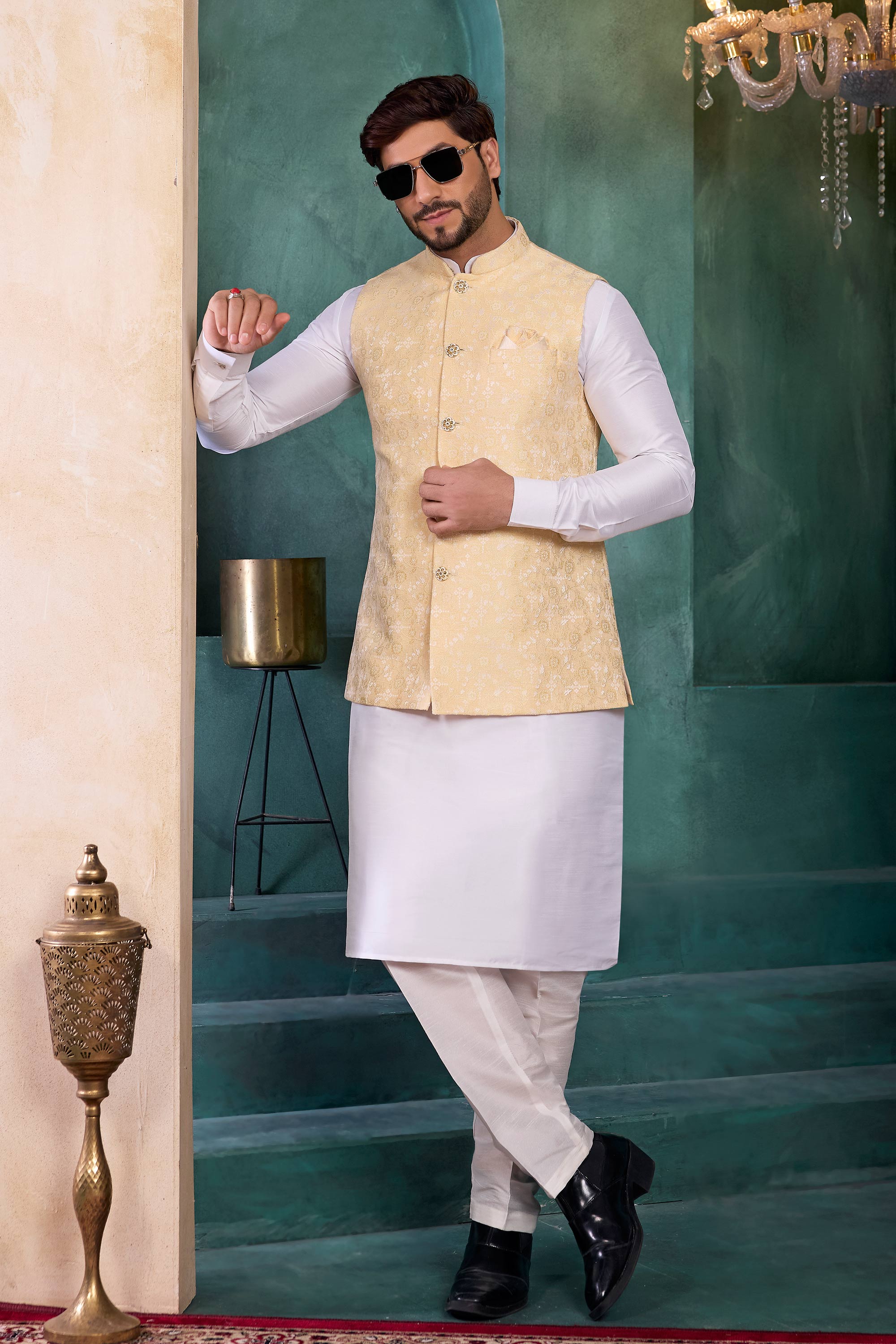 Enhance your festive look with this Color Wedding Function Designer Readymade 3-Piece Kurta Set for men. The outfit consists of a comfortable kurta, a designer jacket, and a classic Aligadhi pant for a complete and fashionable traditional style. Ideal for weddings, receptions, or other functions, the detailed craftsmanship ensures a flawless finish. Its tailored fit and durable fabric provide all-day ease and style. With a bold color and unique design elements, this set blends tradition with contemporary fashion effortlessly. Pair with formal shoes to create a striking impression wherever you go!