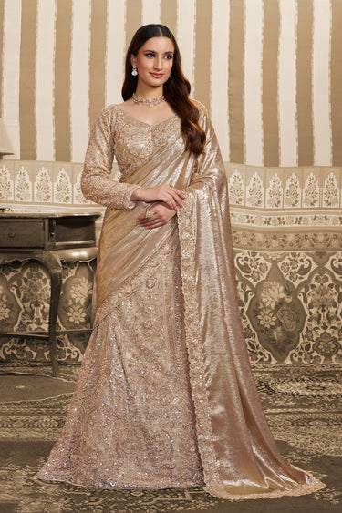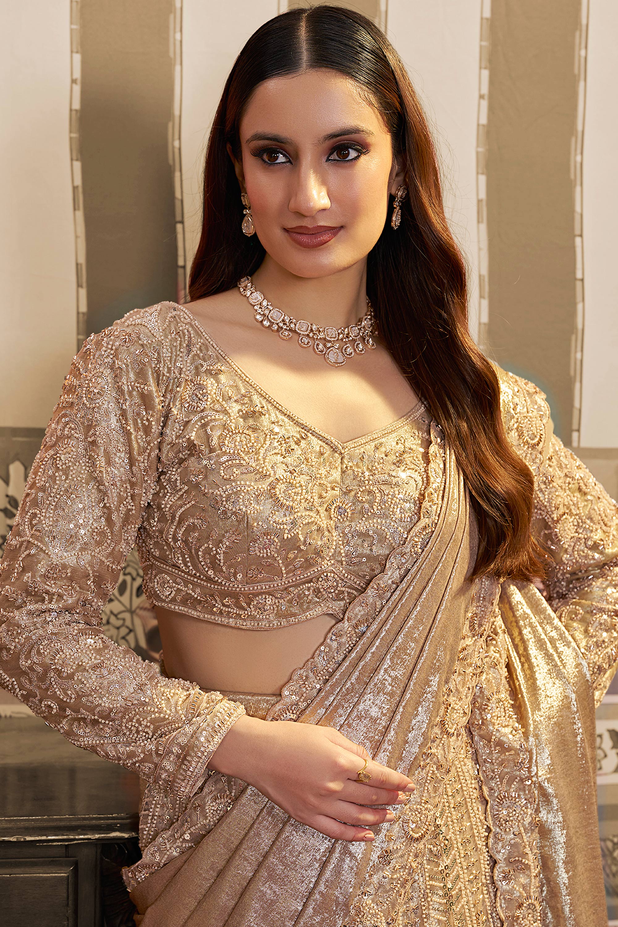 Sequins Work Satin Beige Wedding Wear Lehenga Saree