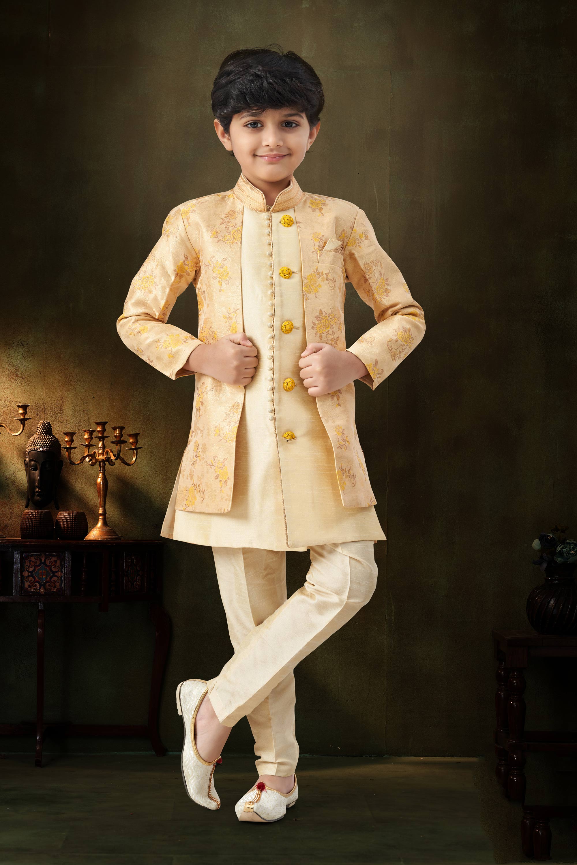 Cream Festive Wear Jacquard Fabric Readymade Indo Western For Boys