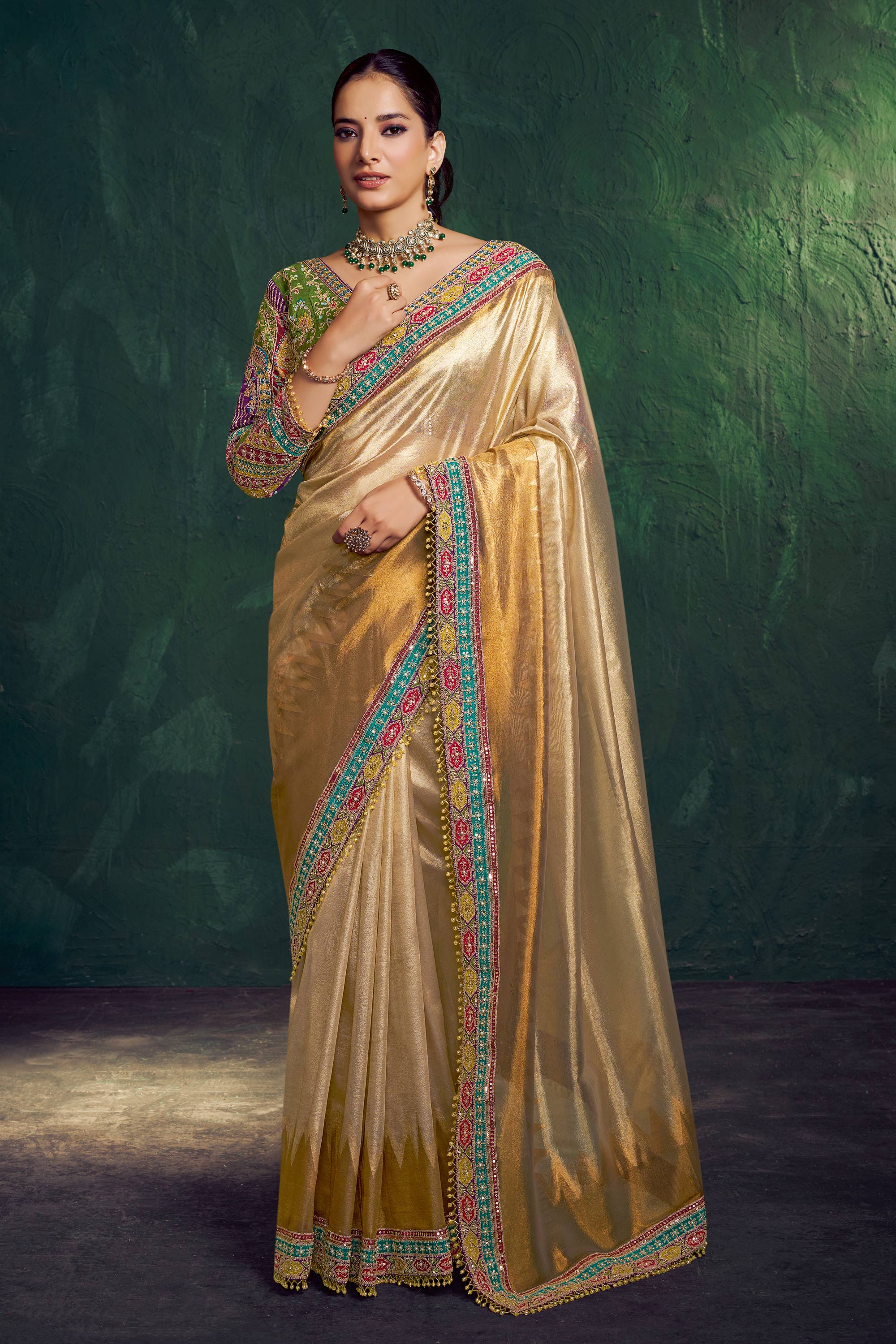 Beige Wedding Wear Tissue Embroidered Border Work Saree