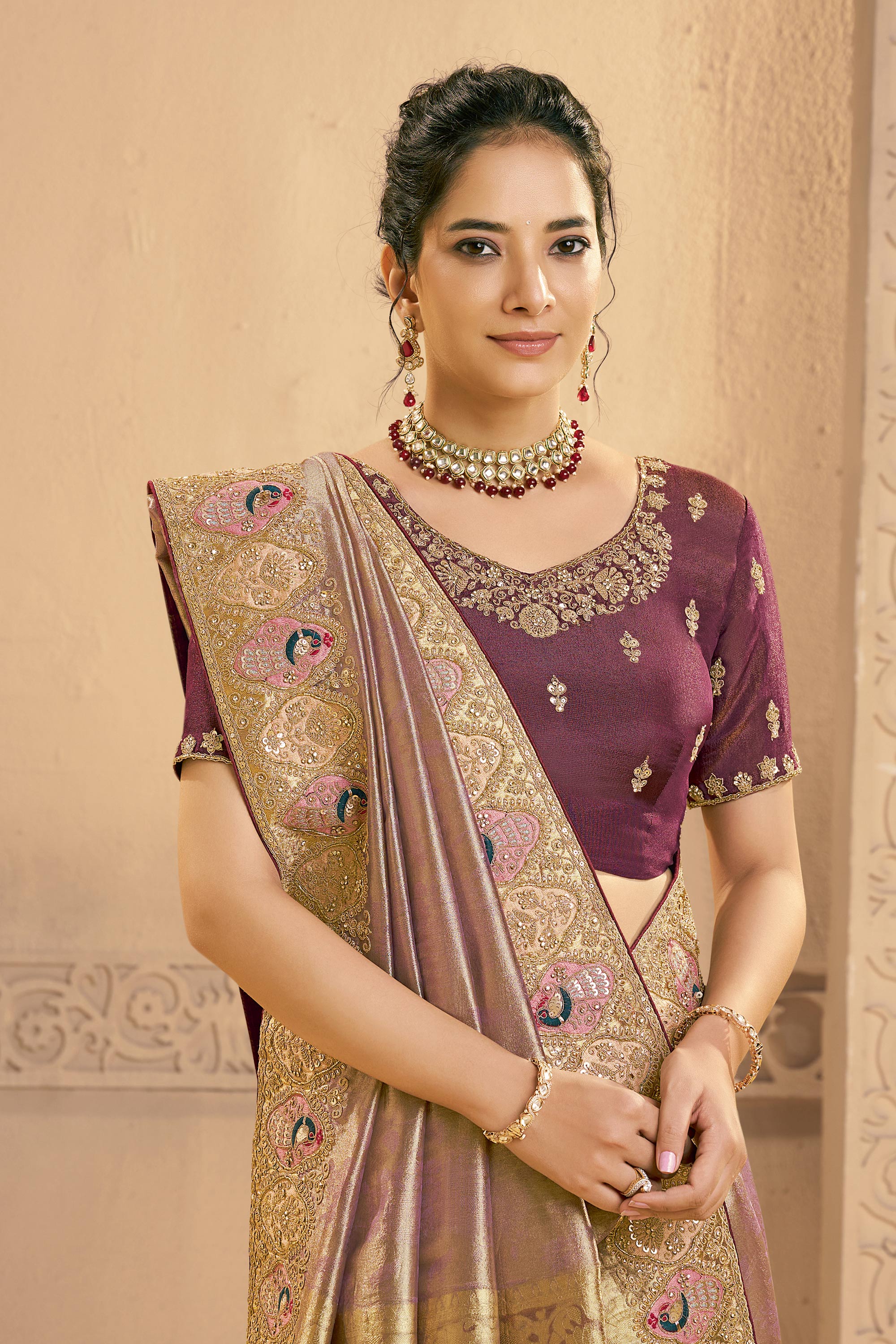 Border Work Wine Wedding Wear Saree