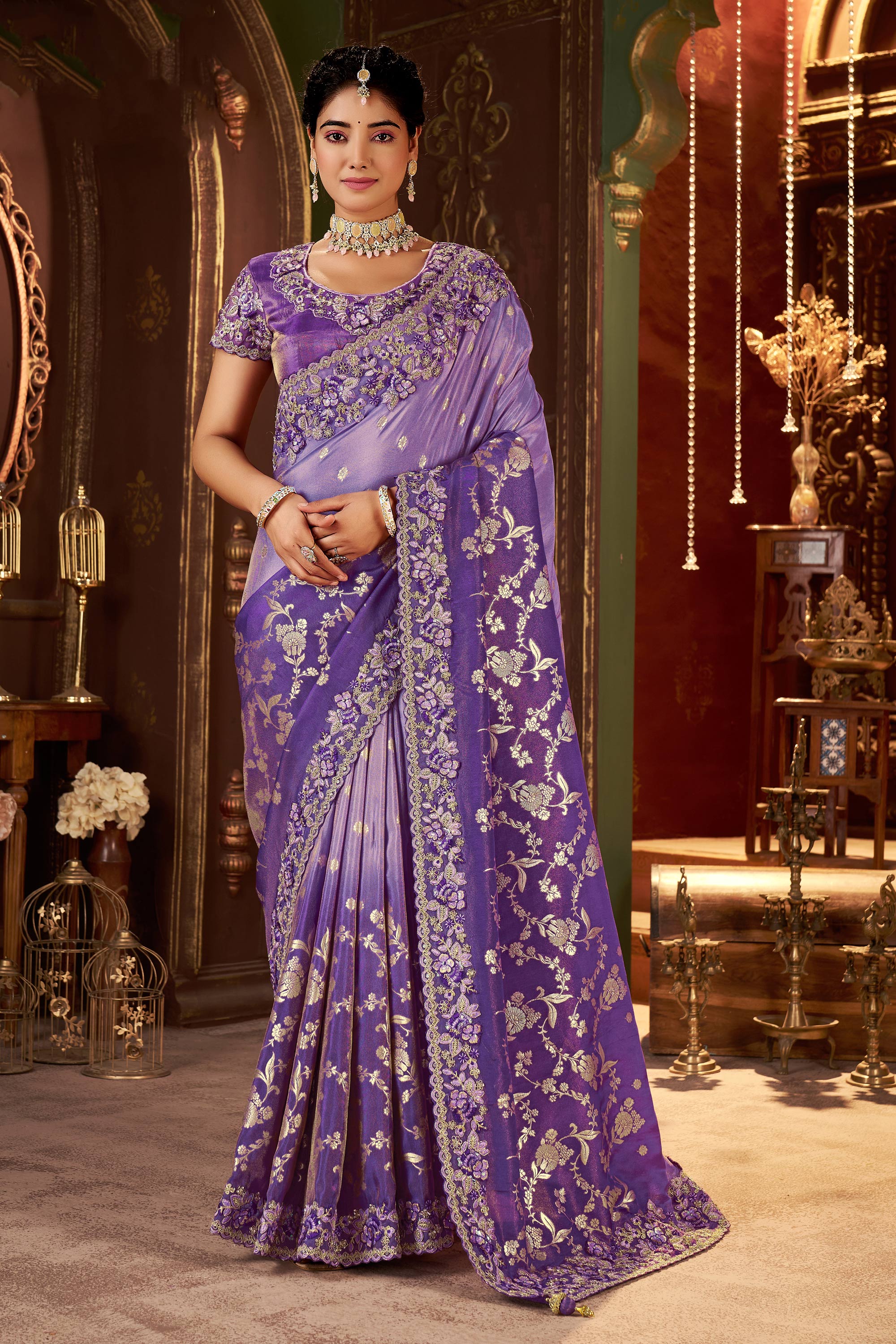 Embroidered Border Work Purple Saree For Function Wear