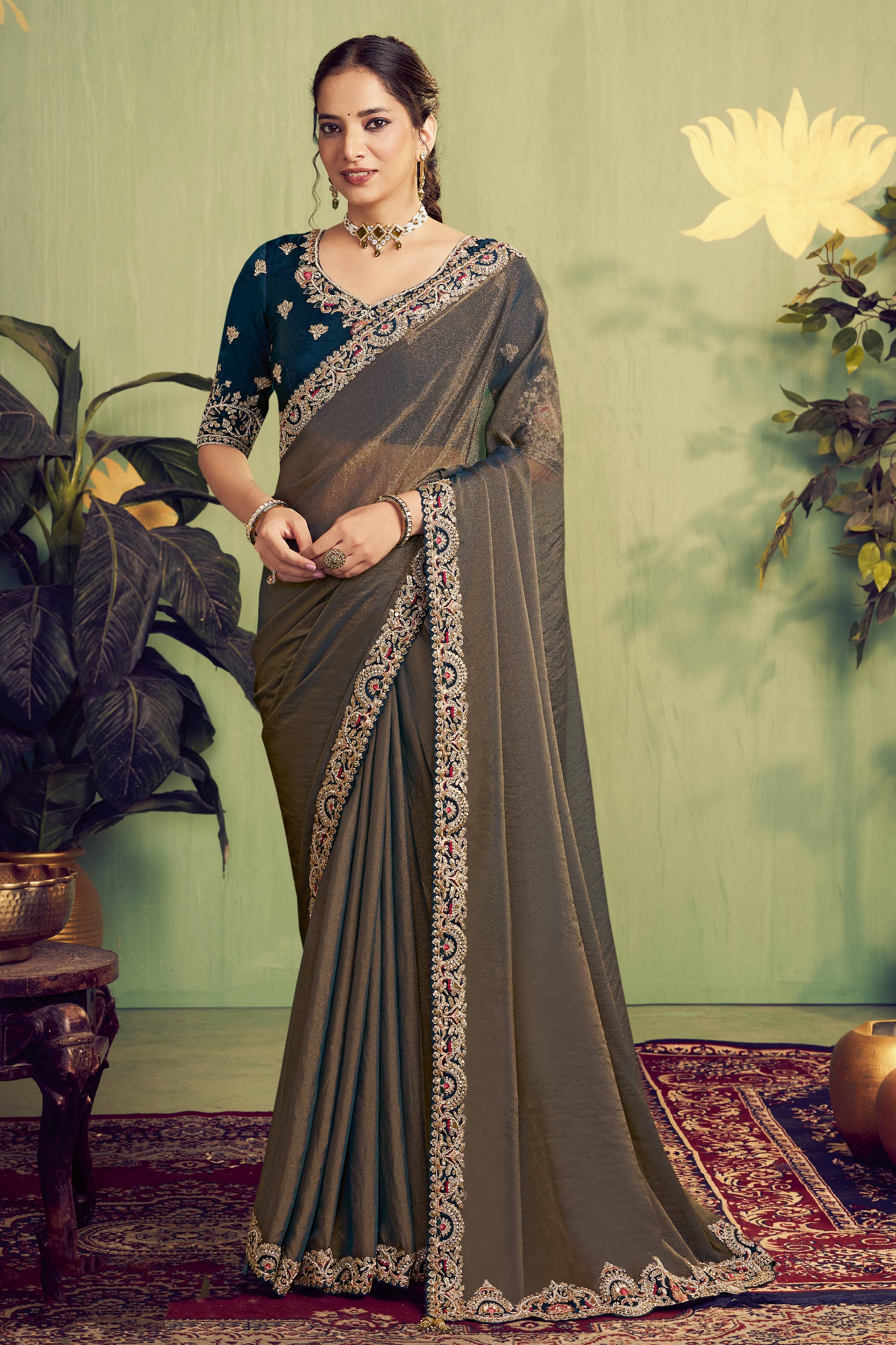 Organza Satin Border Work Teal Wedding Wear Saree