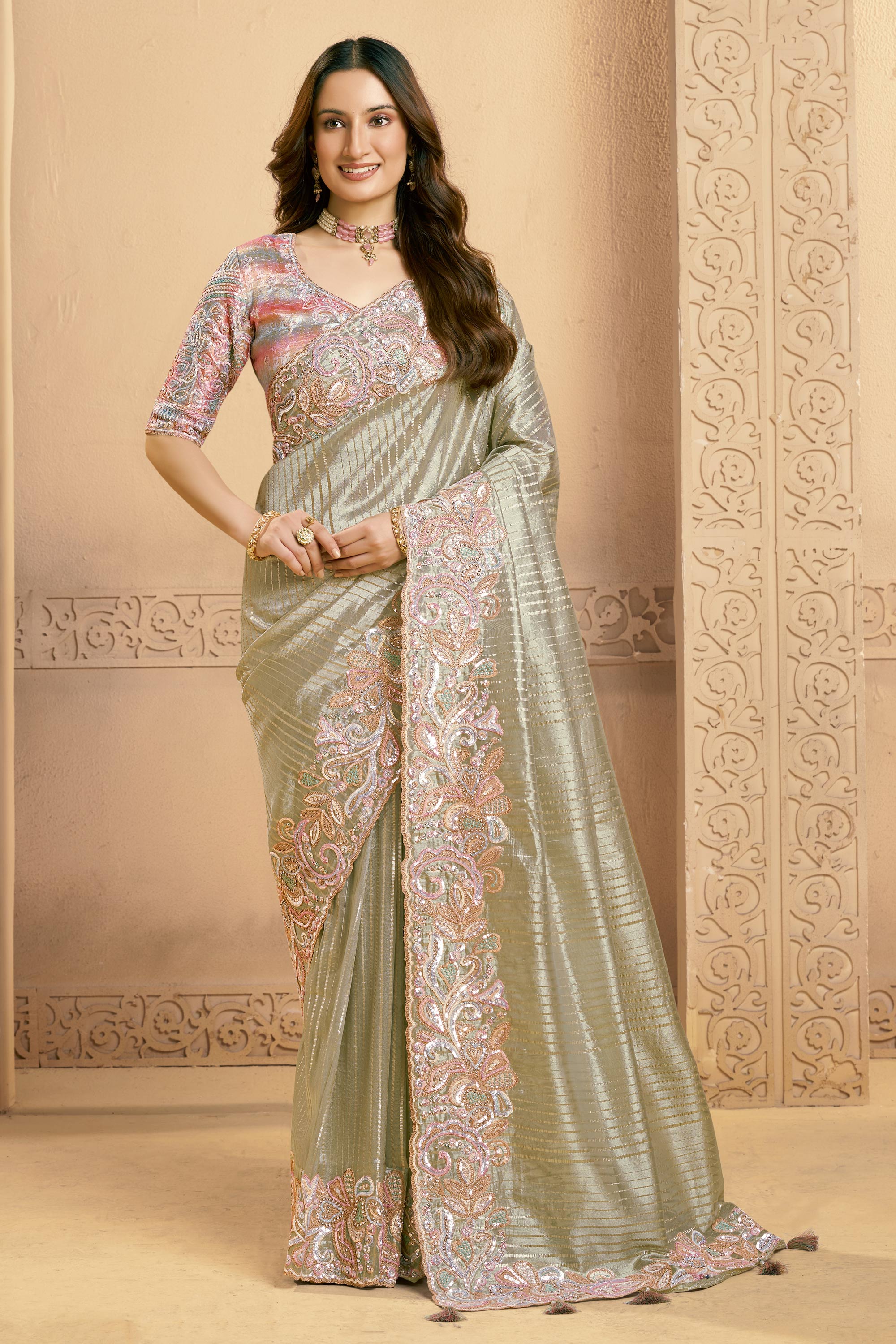 Sea Green Tissue Border Work Wedding Wear Saree