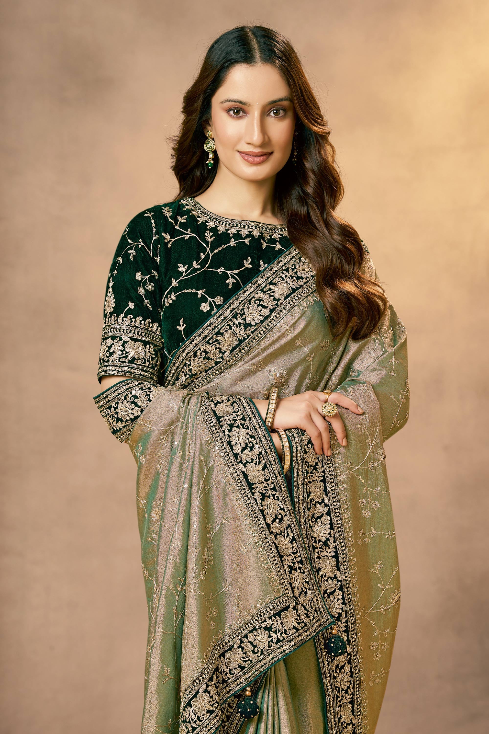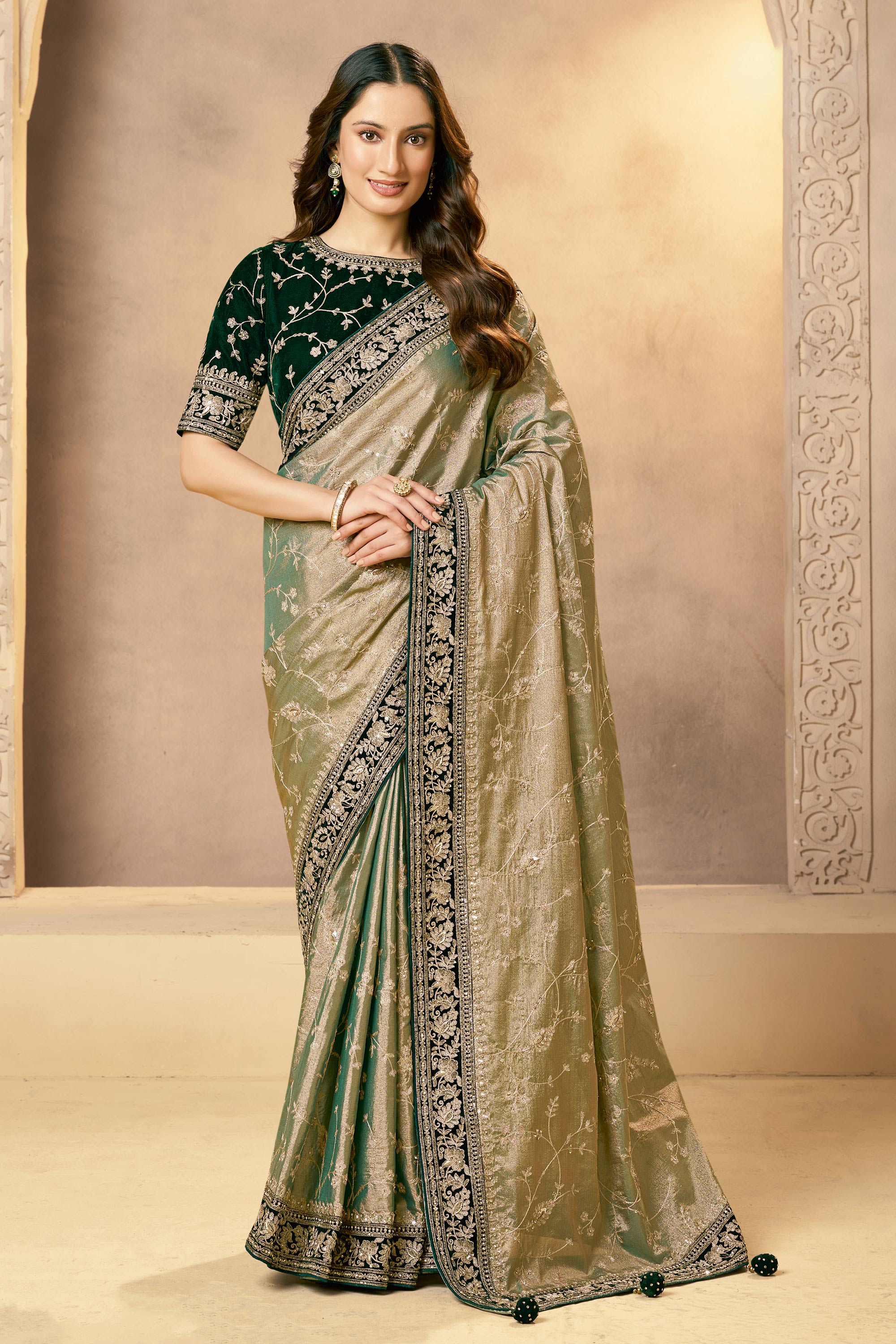 Tissue Silk Fabric Green Wedding Wear Saree