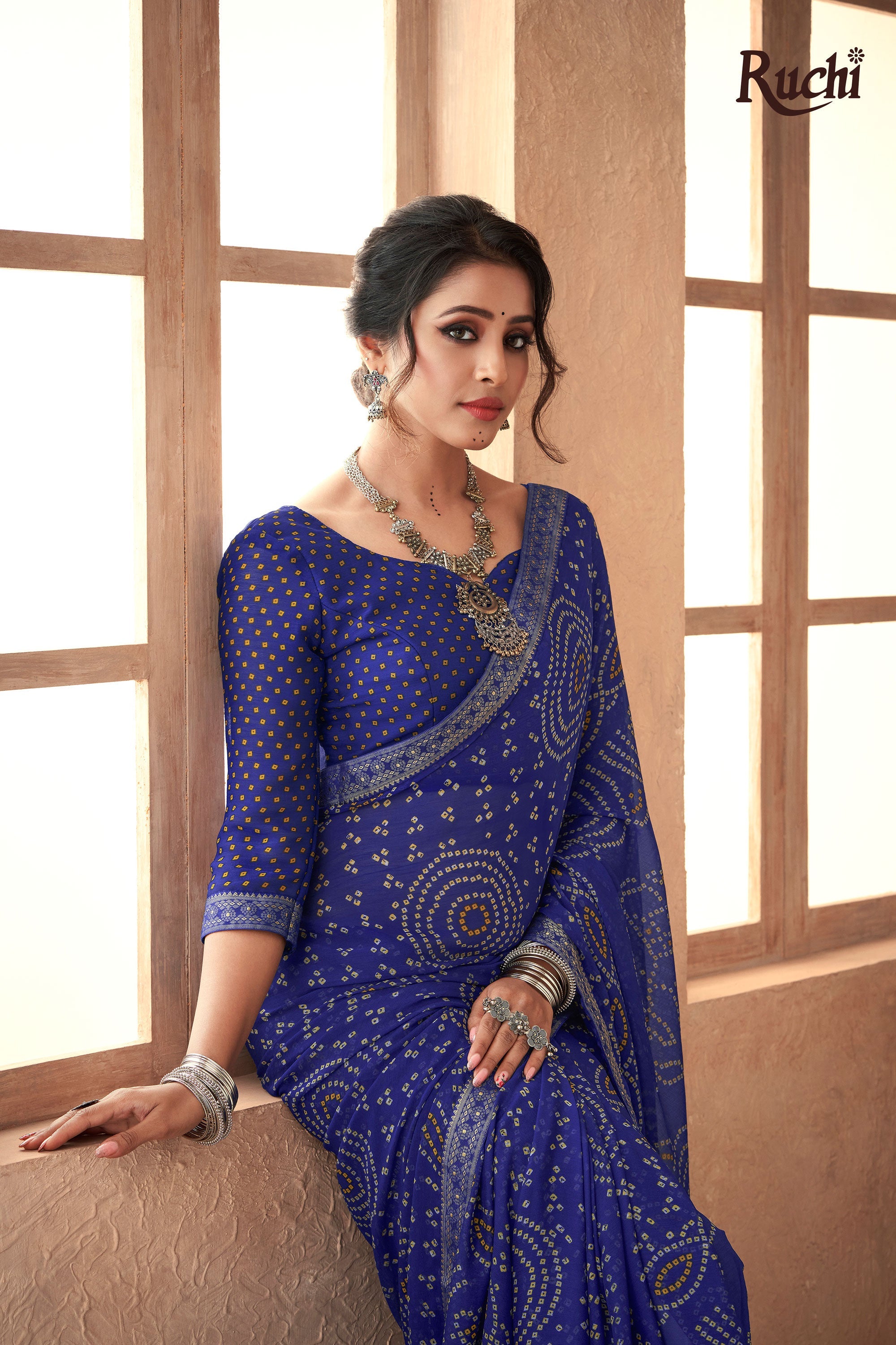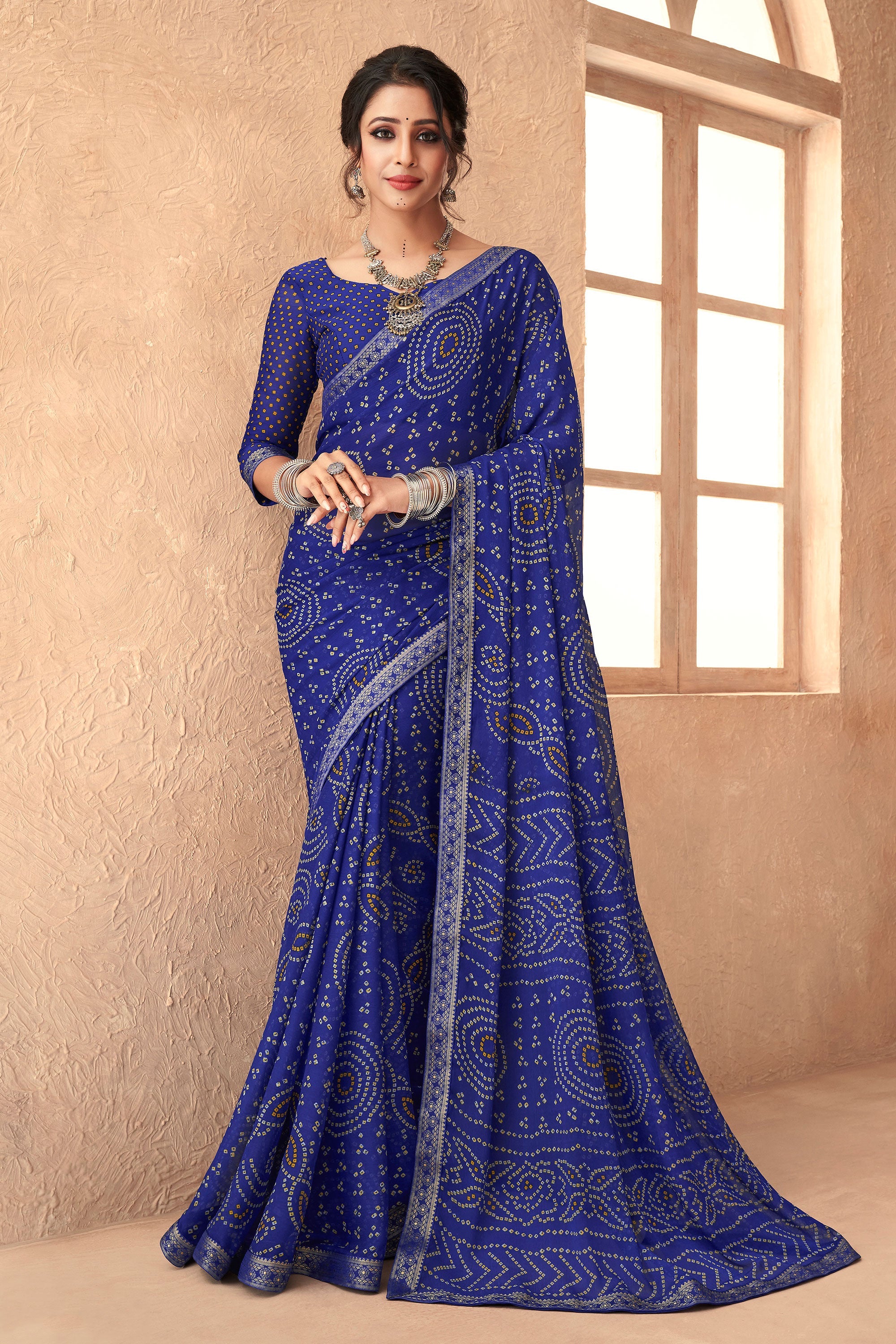 Chiffon Blue Bandhani Print Attached Banarasi Border Saree