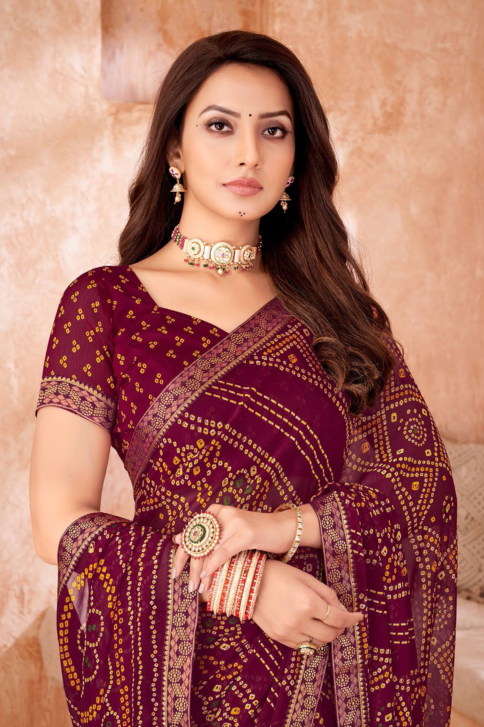 This Bandhej Print Chiffon Saree with Blouse Piece is the perfect choice for your everyday fashion needs. Made from breathable chiffon, the saree drapes beautifully, offering style and ease in every step. The intricate Bandhej design showcases traditional artistry, giving a fresh look to a classic style. Ideal for daily wear, this saree combines practicality with charm, making it suitable for both work and leisure occasions. Its soft fabric ensures lasting comfort throughout the day.