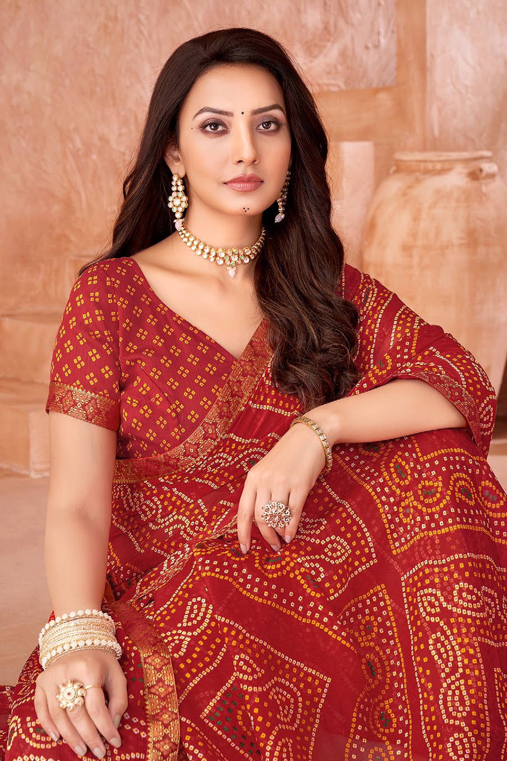 Enhance your everyday look with this vibrant Bandhej Print Chiffon Saree that comes paired with a matching blouse piece. The soft and lightweight chiffon fabric offers effortless elegance and all-day comfort. Perfect for casual or semi-formal occasions, the Bandhej print celebrates cultural heritage in a simple yet stylish way. This saree’s airy texture makes it ideal for hot weather, allowing you to stay cool and look radiant wherever you go.