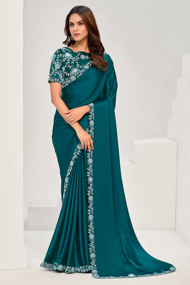 Teal Color Crepe Satin Silk Fabric Stunning Saree