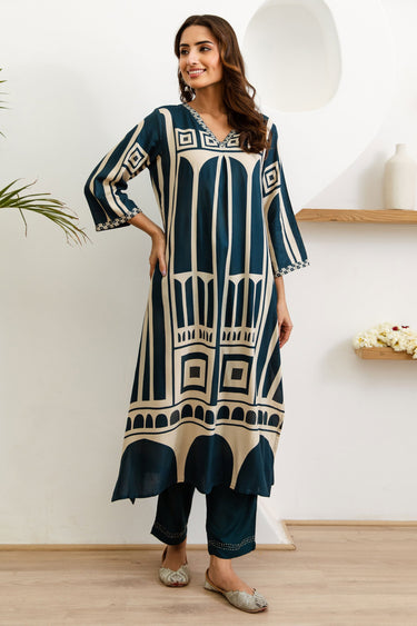 Exclusive Blue Abstract Geometric Print Ethnic Set