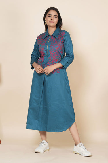 Exclusive Teal Blue Embroidered Thread Work Poplin Dress