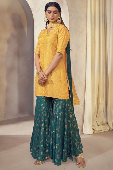 Exclusive Yellow Color Dola Silk Jacquard Fabric Weaving Jacquard Readymade Sharara Set