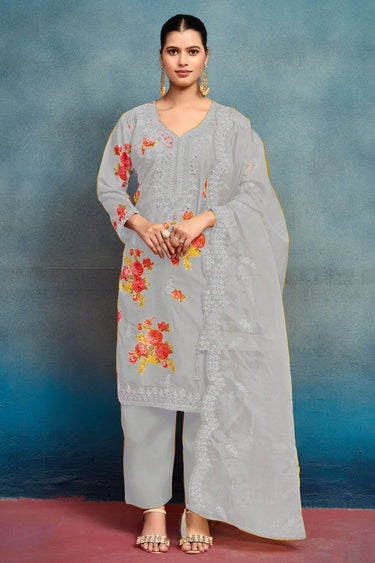 Attractive Grey Art Silk Embroidered Suit