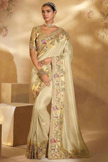 Cream Color Silk Fabric Engaging Heavy Embroidered Saree