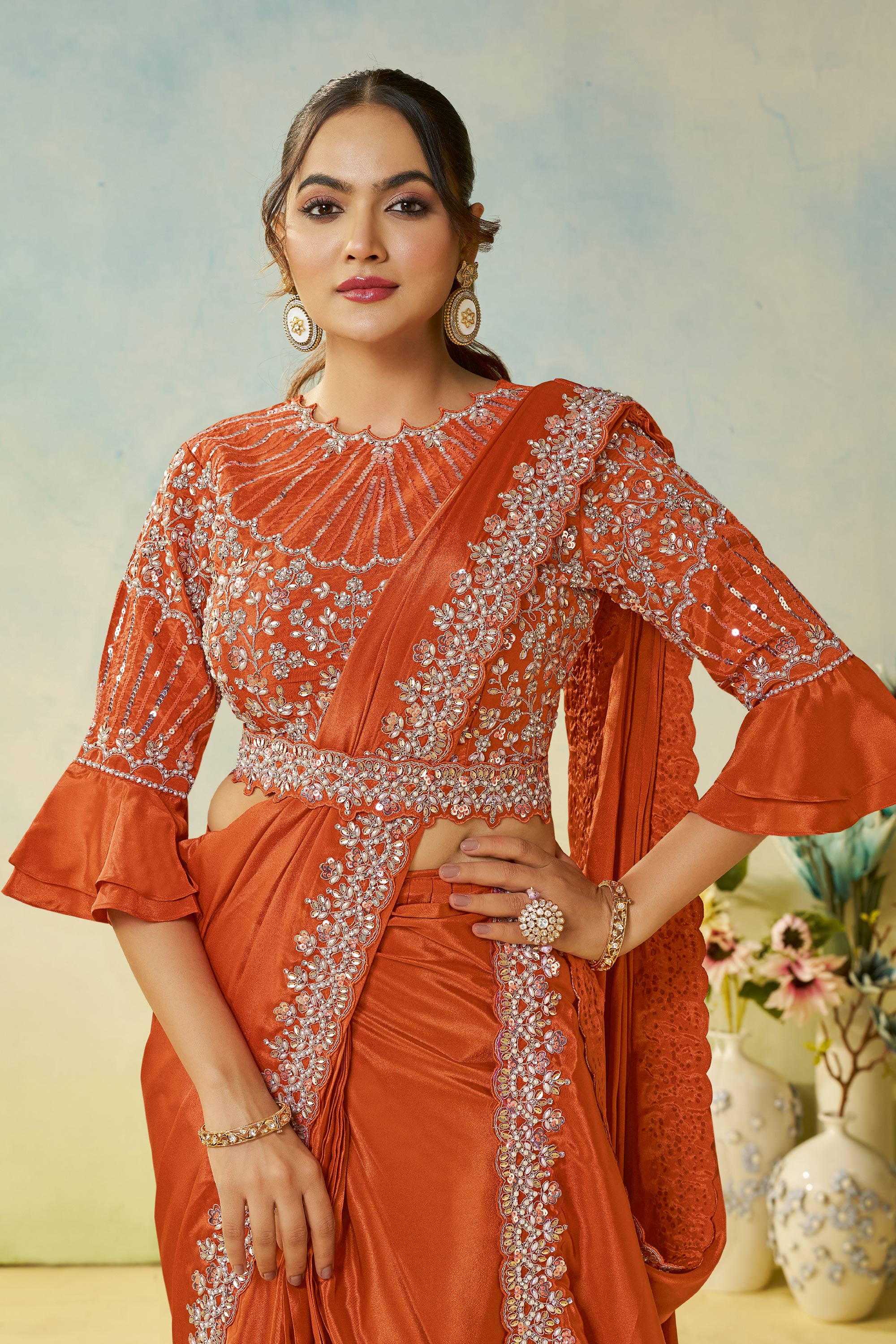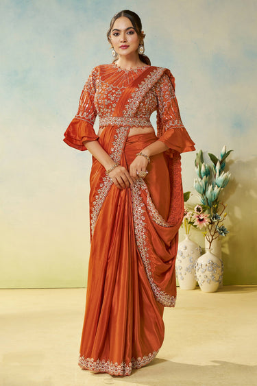 Satin Silk Rust Border Work Readymade Saree For Wedding Wear