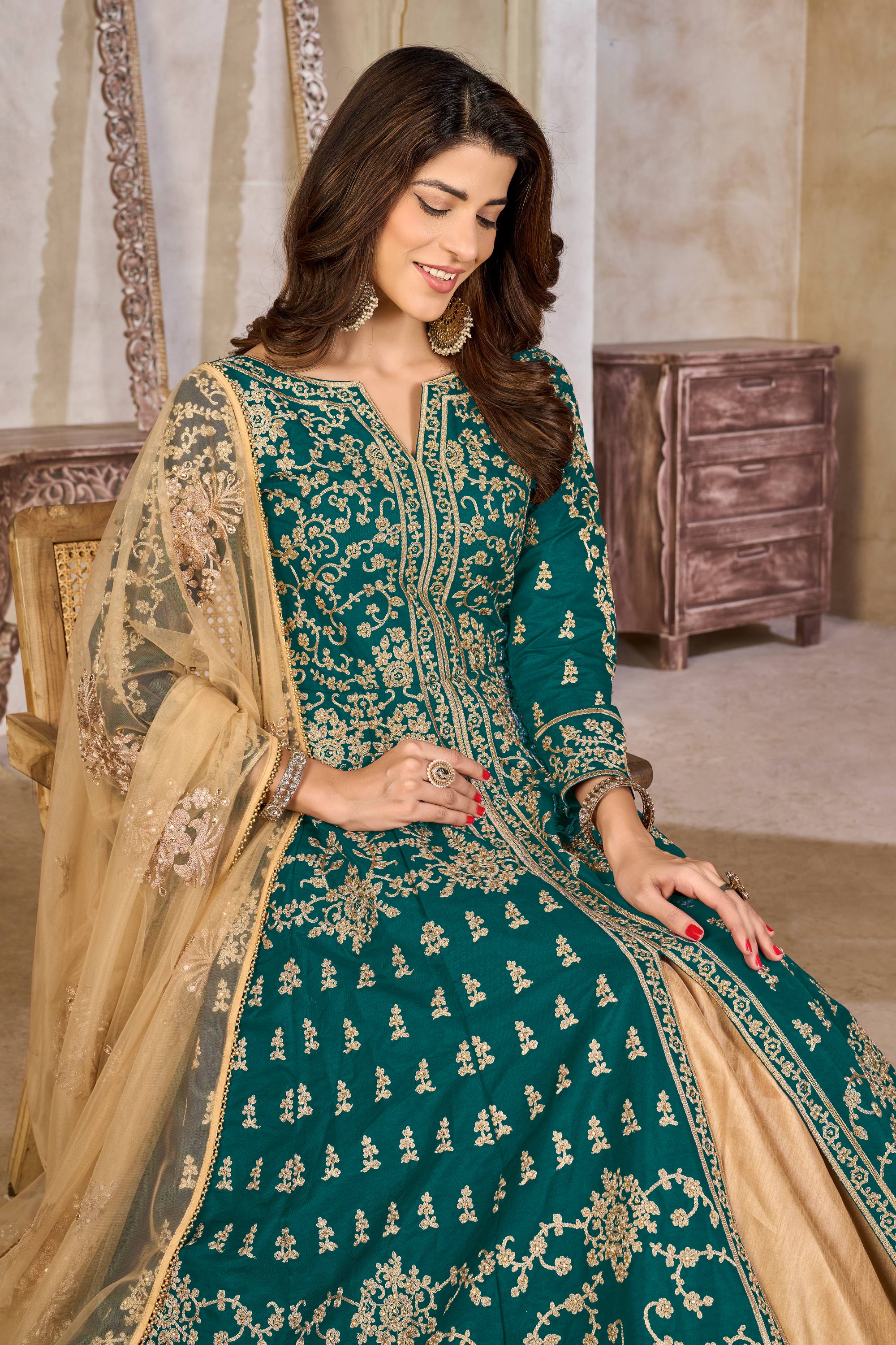 Art Silk Embroidered Work Teal Designer Long Flair Anarkali Suit