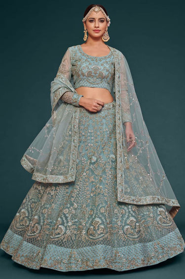 Engaging Light Cyan Color Net Fabric Embroidered Work Lehenga