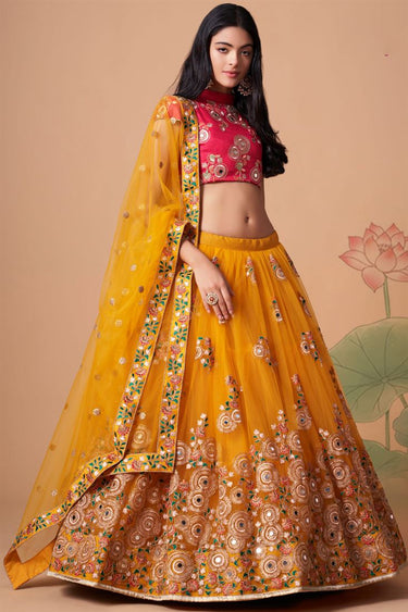 Tempting Net Fabric Yellow Color Lehenga Choli In Sangeet Wear