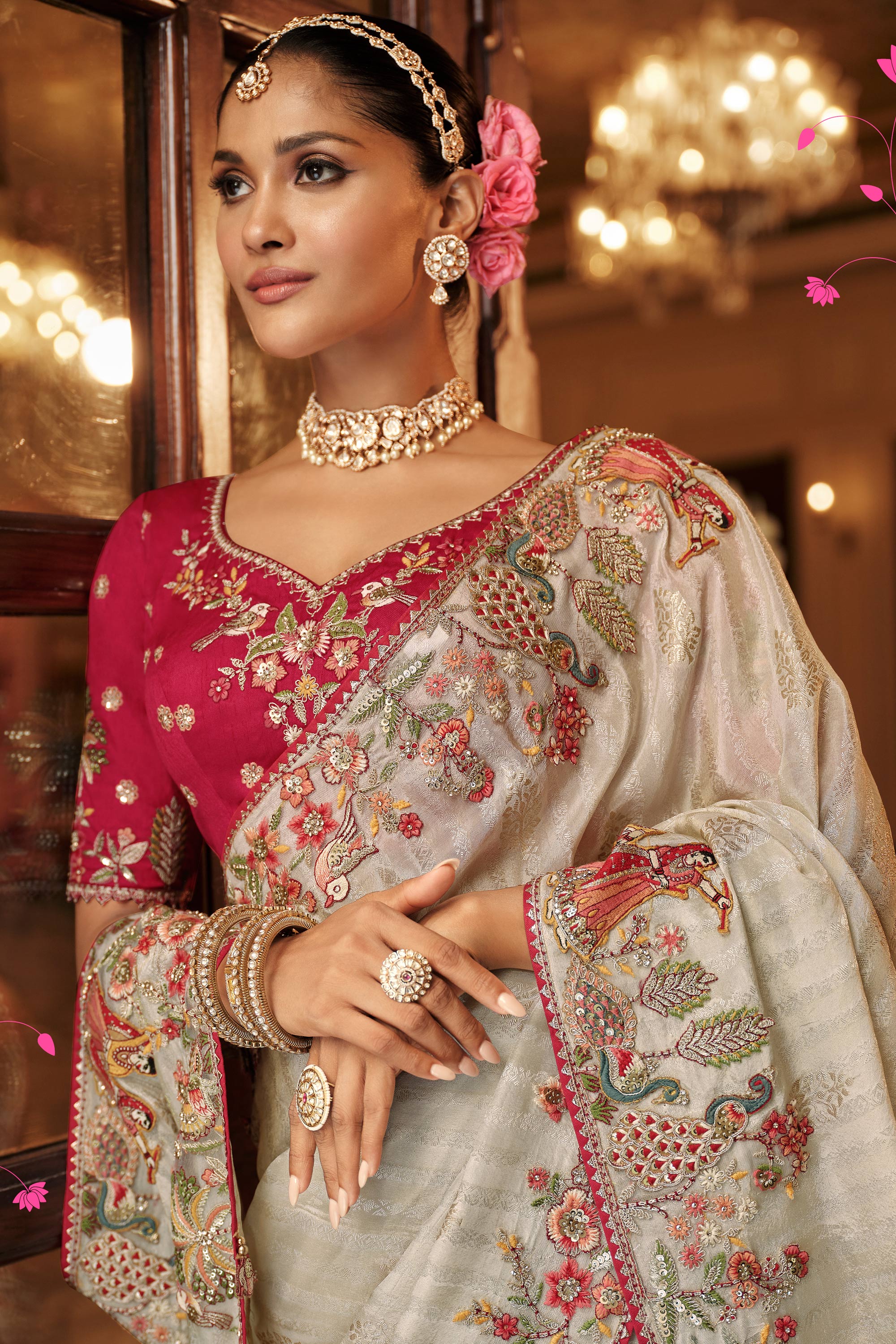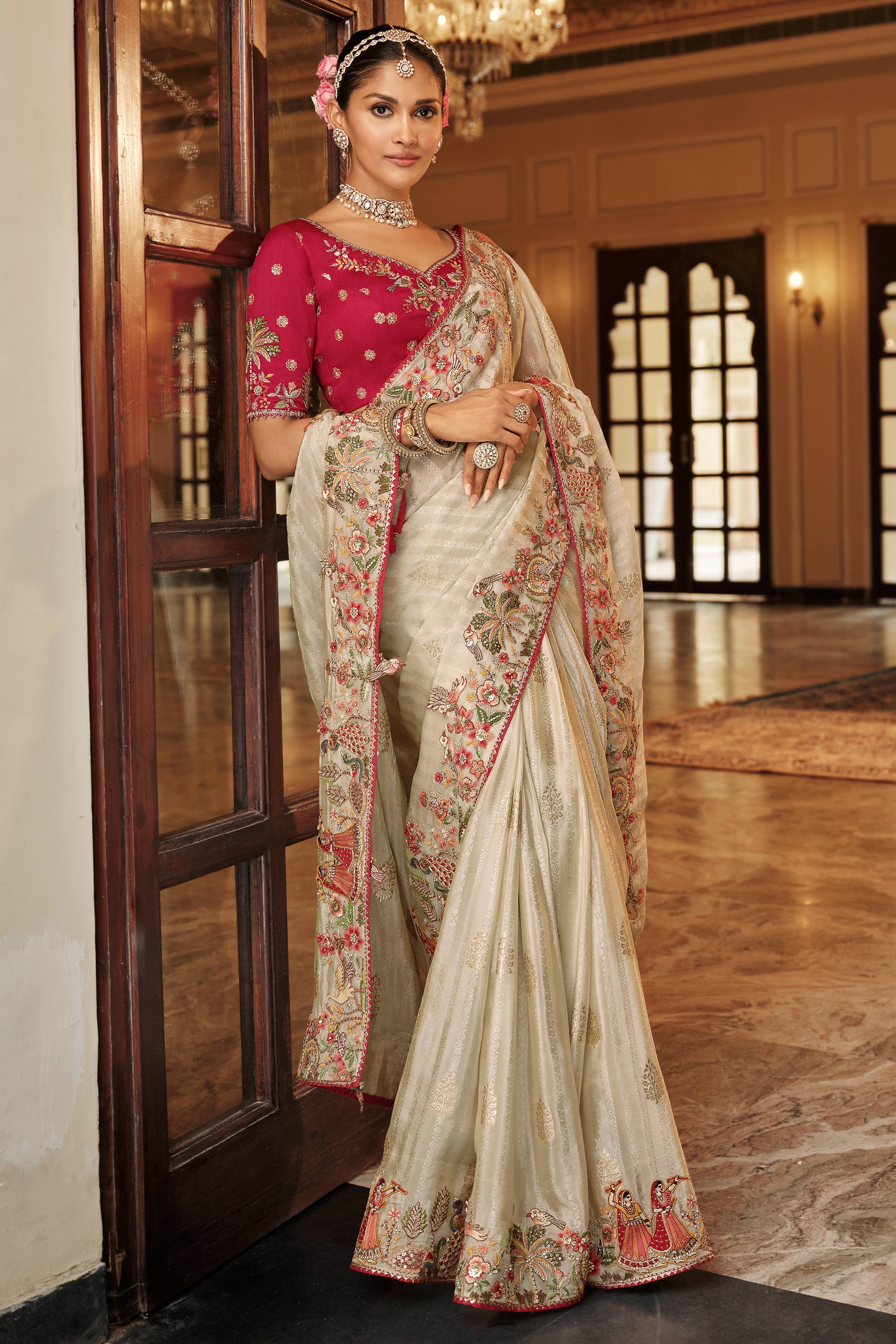 Viscose Jacquard Beige Embroidered Border Work Function Wear Saree