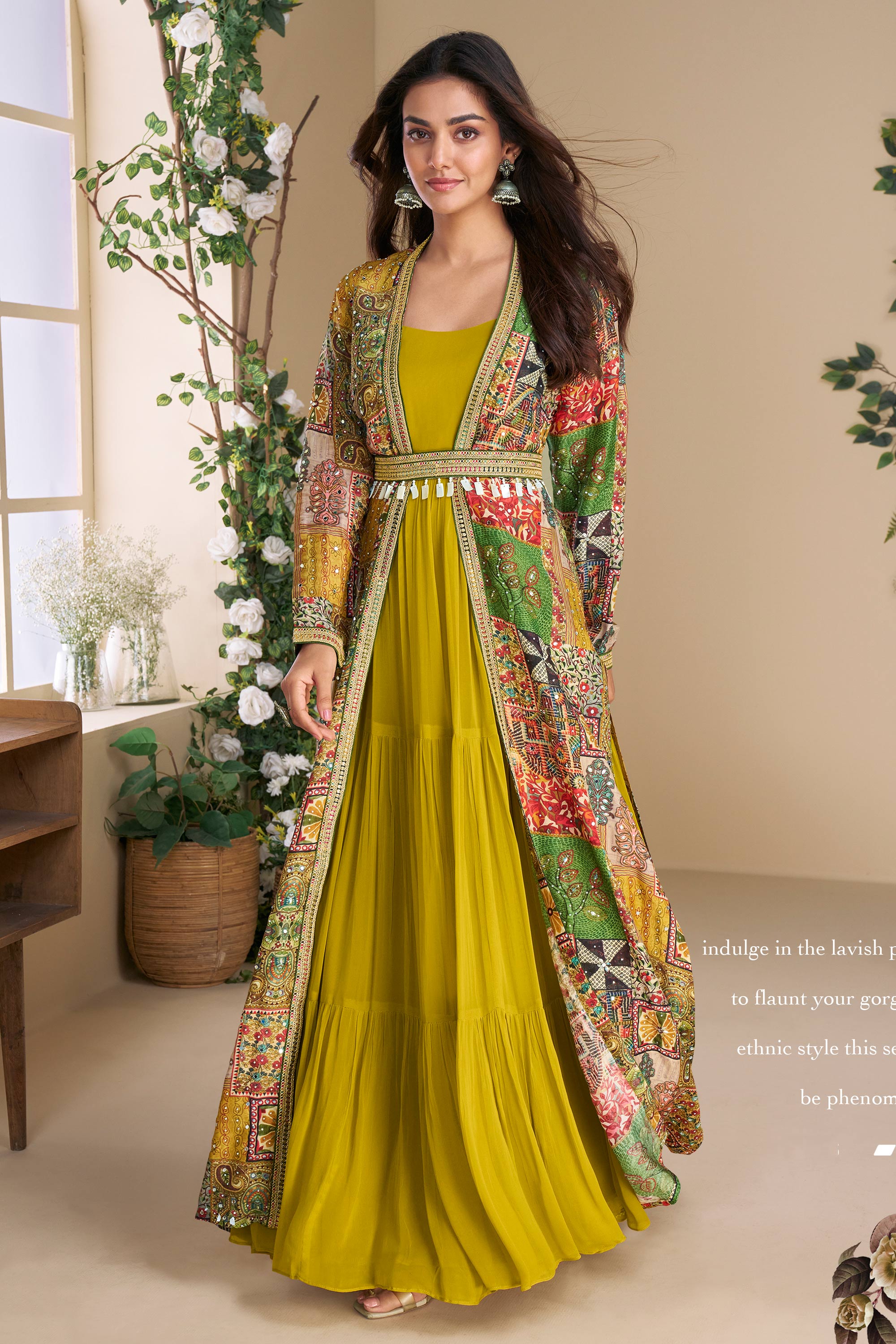 Yellow Printed Anarkali Style Gown With Shrug