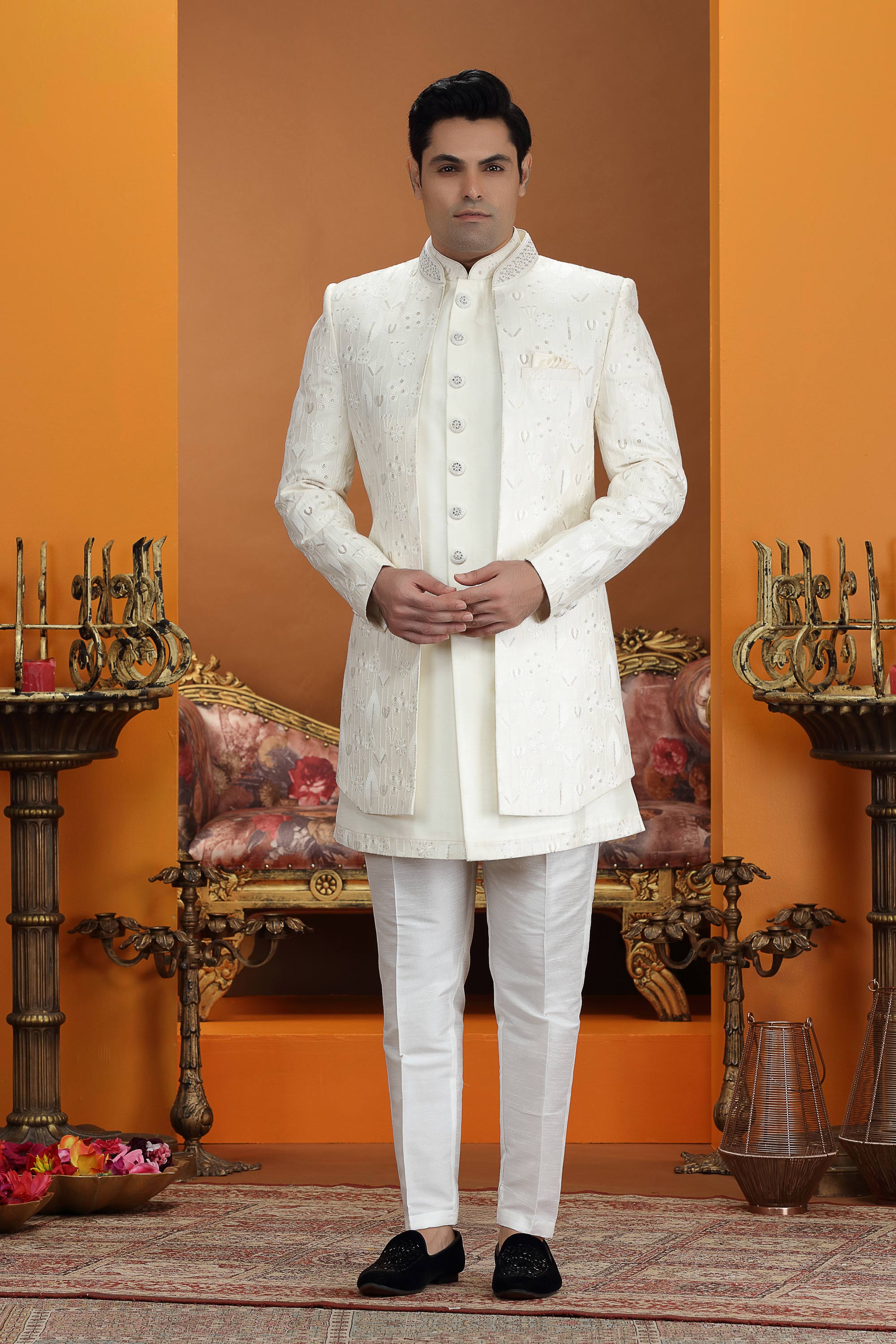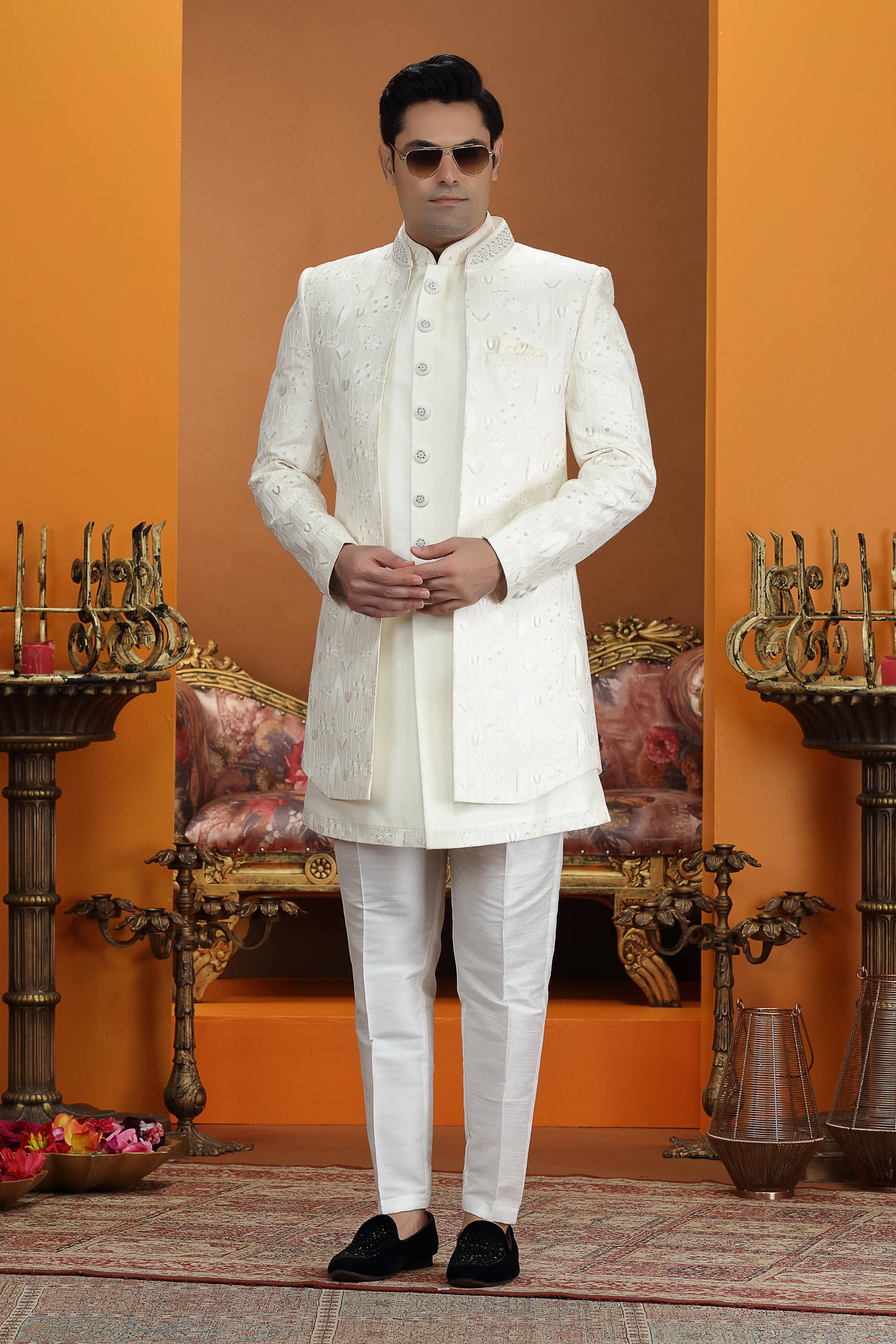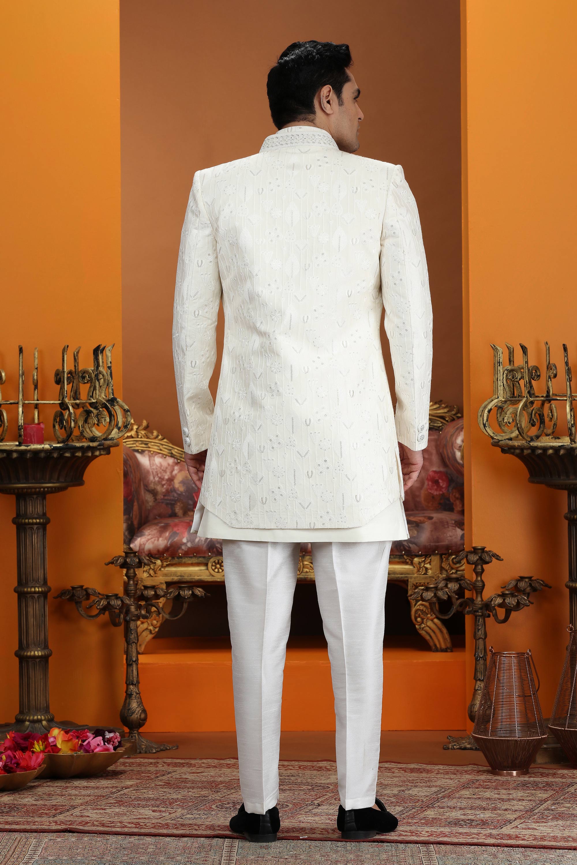 The outfit is paired with Dupion art silk Aligadhi pants, offering a traditional yet comfortable fit. A smooth faux satin lining ensures ease of wear during long wedding functions. Intricate embroidery on the jacket adds a touch of grandeur to the overall design. Due to digital photography, slight color variations may occur.