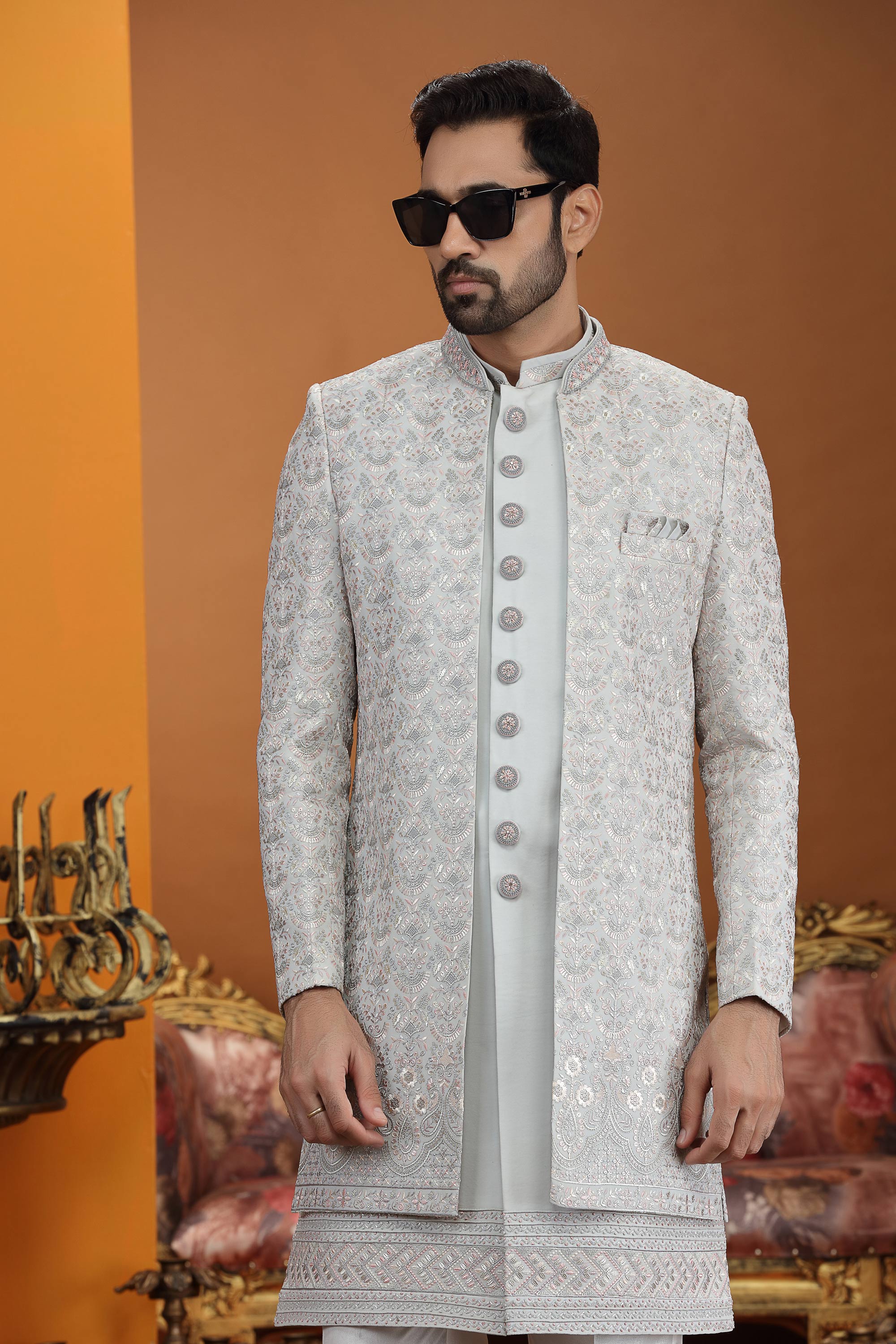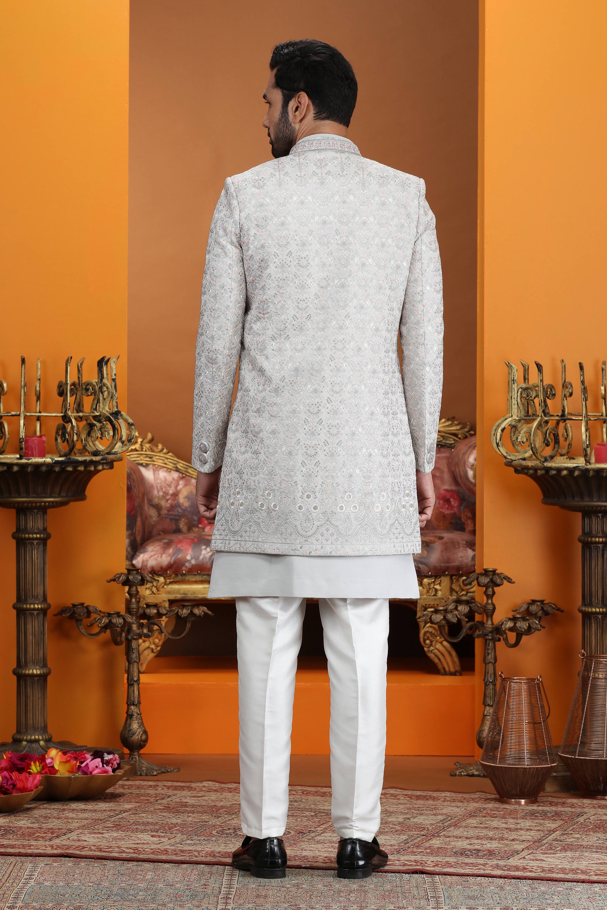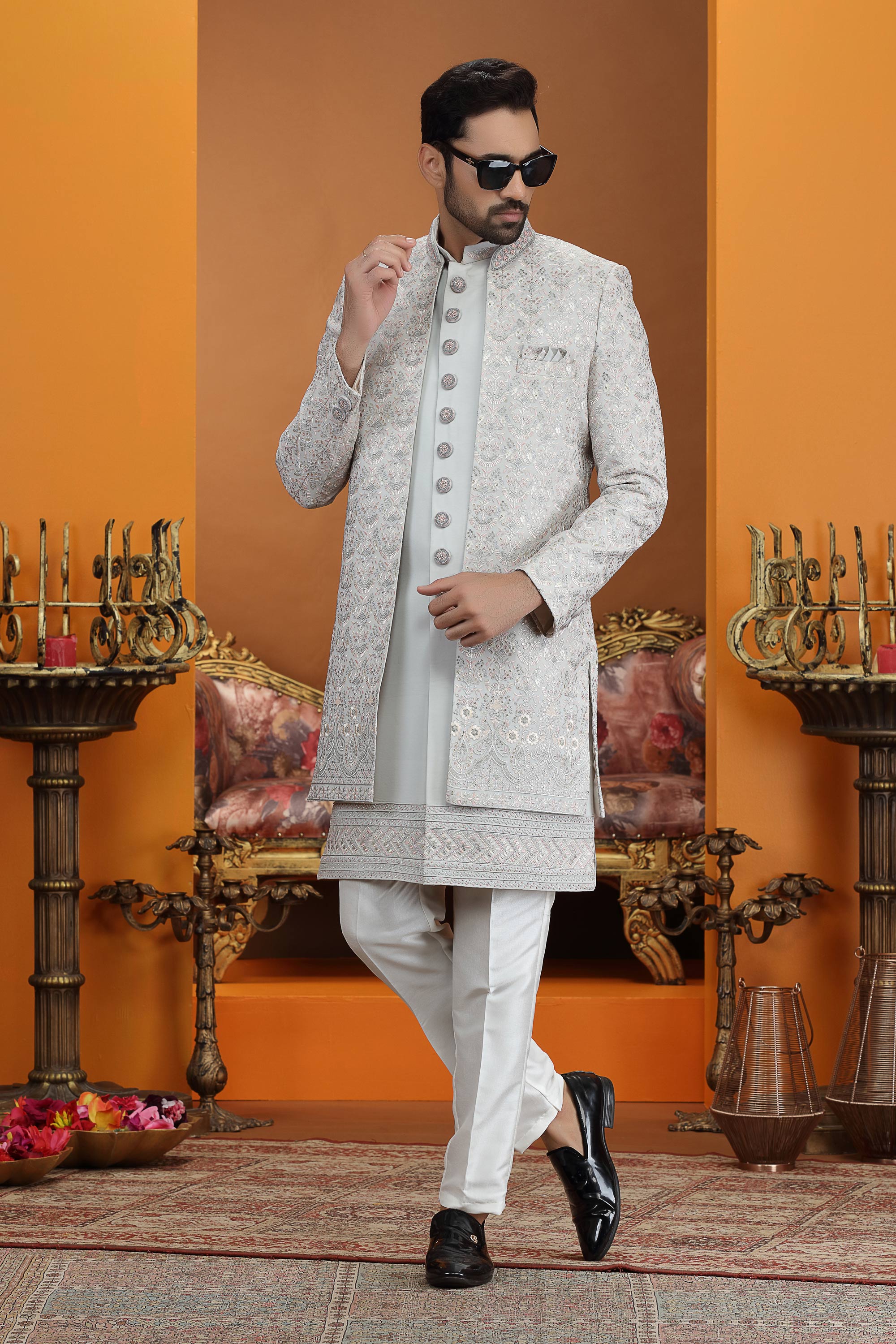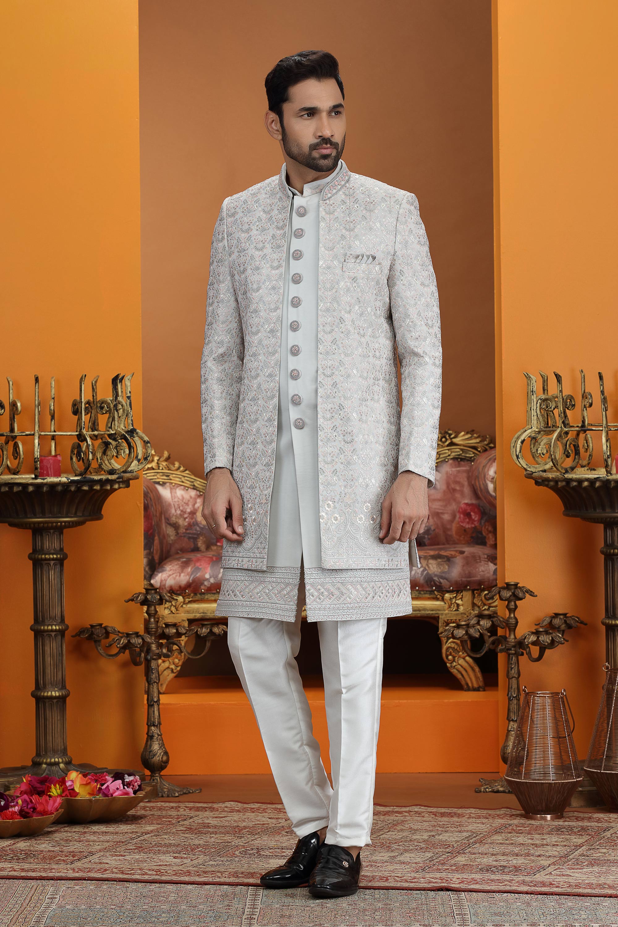 Elevate your wedding style with this regal Men Indo Western, designed to give a classy and sophisticated appearance. The top is made from premium art silk featuring computer thread embroidery work, adding richness and fine detailing. The 3-piece jacket set enhances the royal look, making it ideal for wedding celebrations. Due to digital photography, slight color variations may occur.