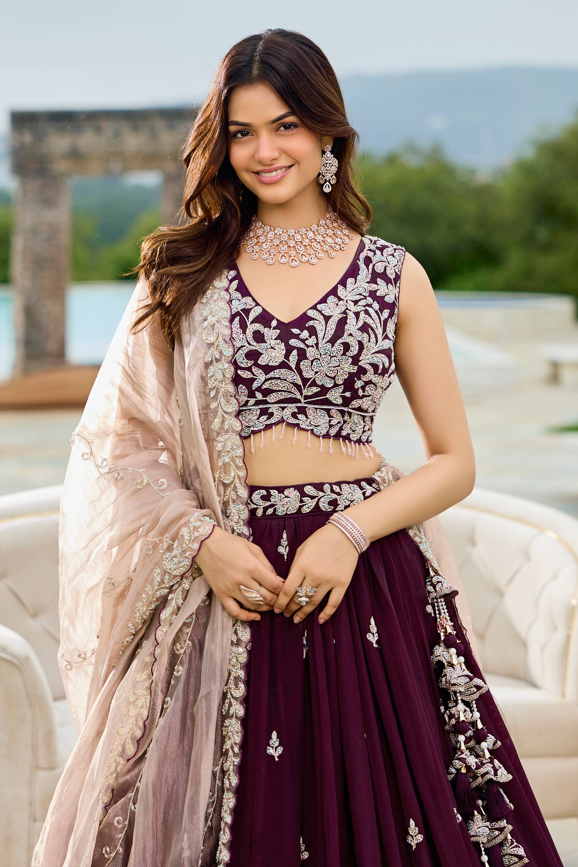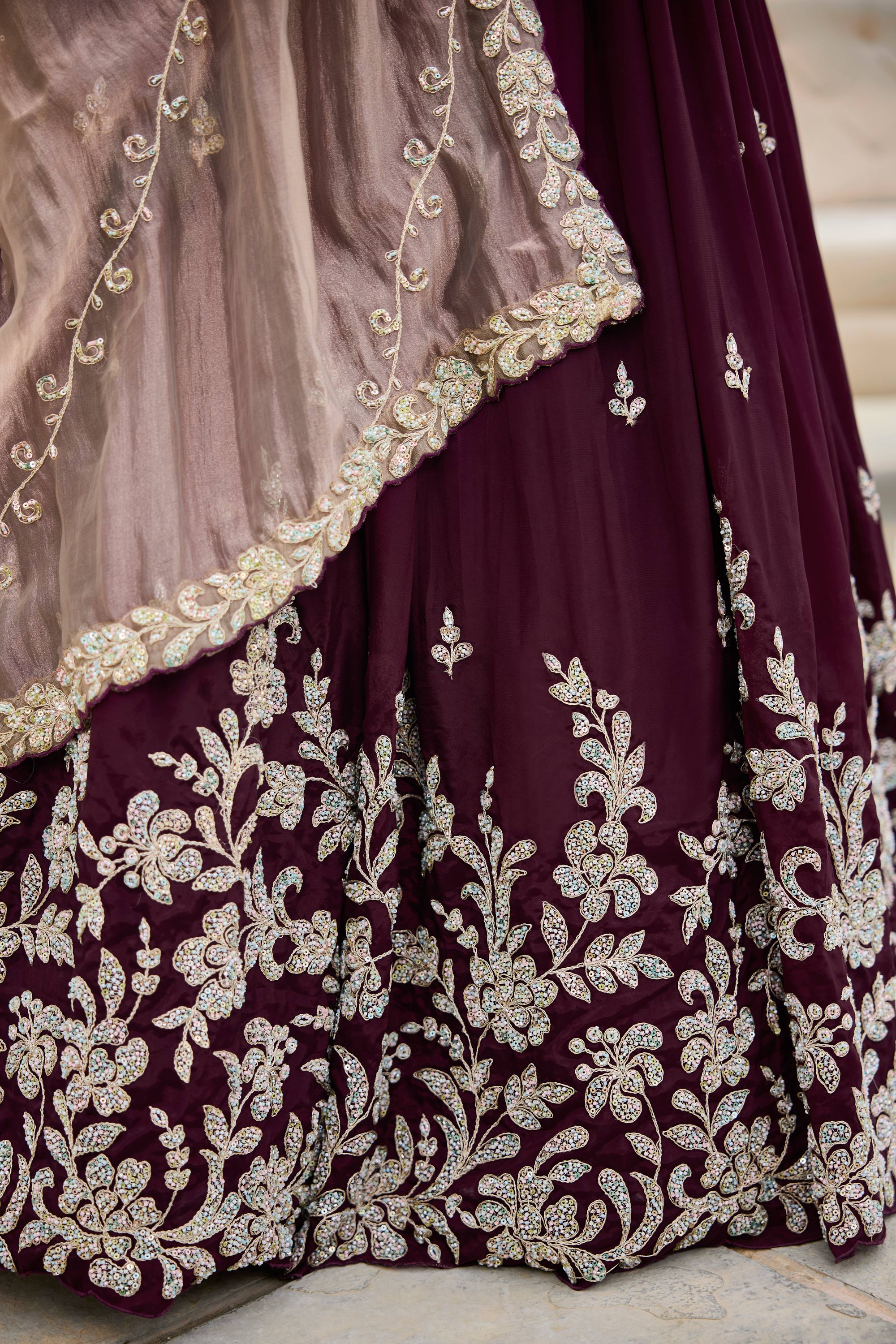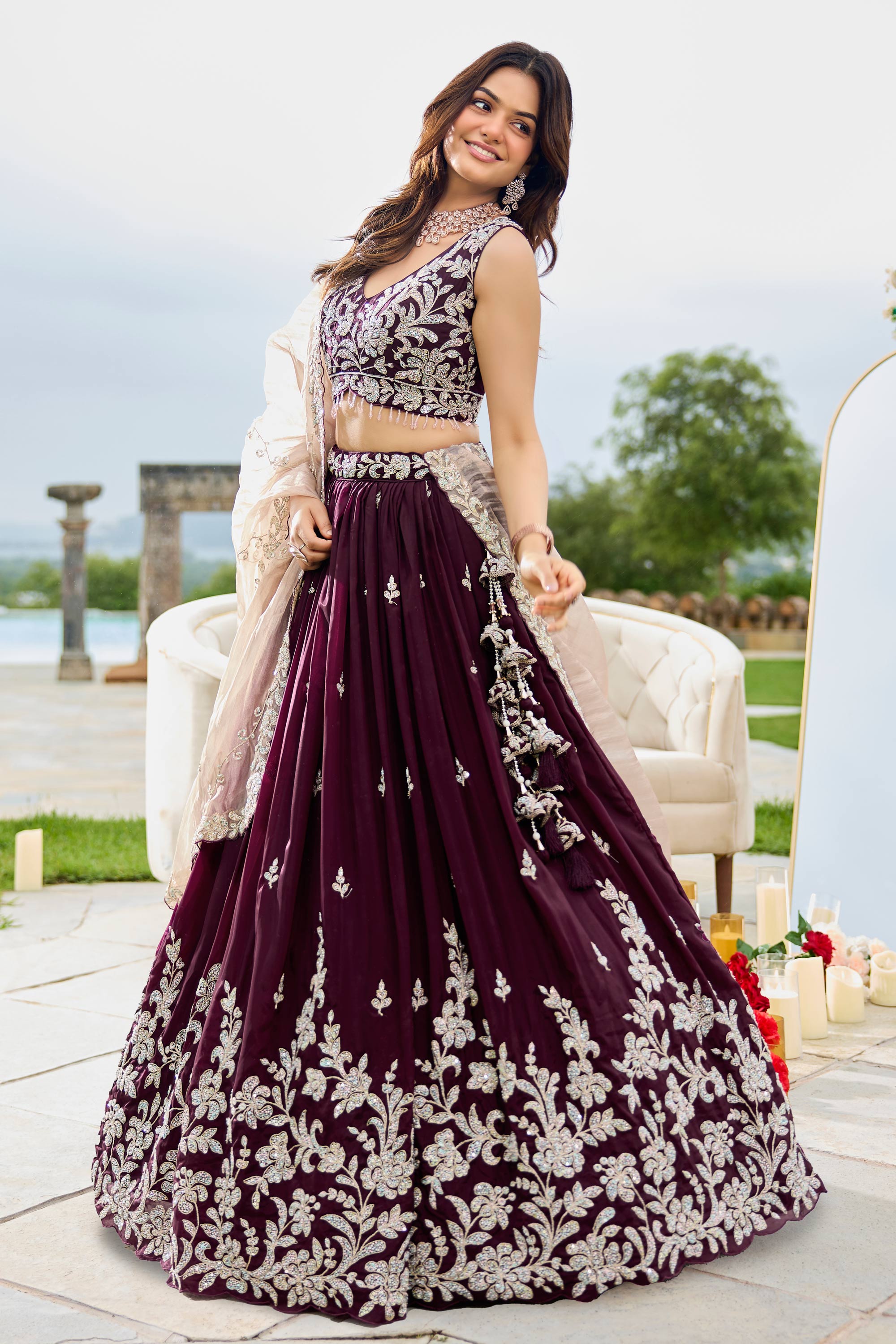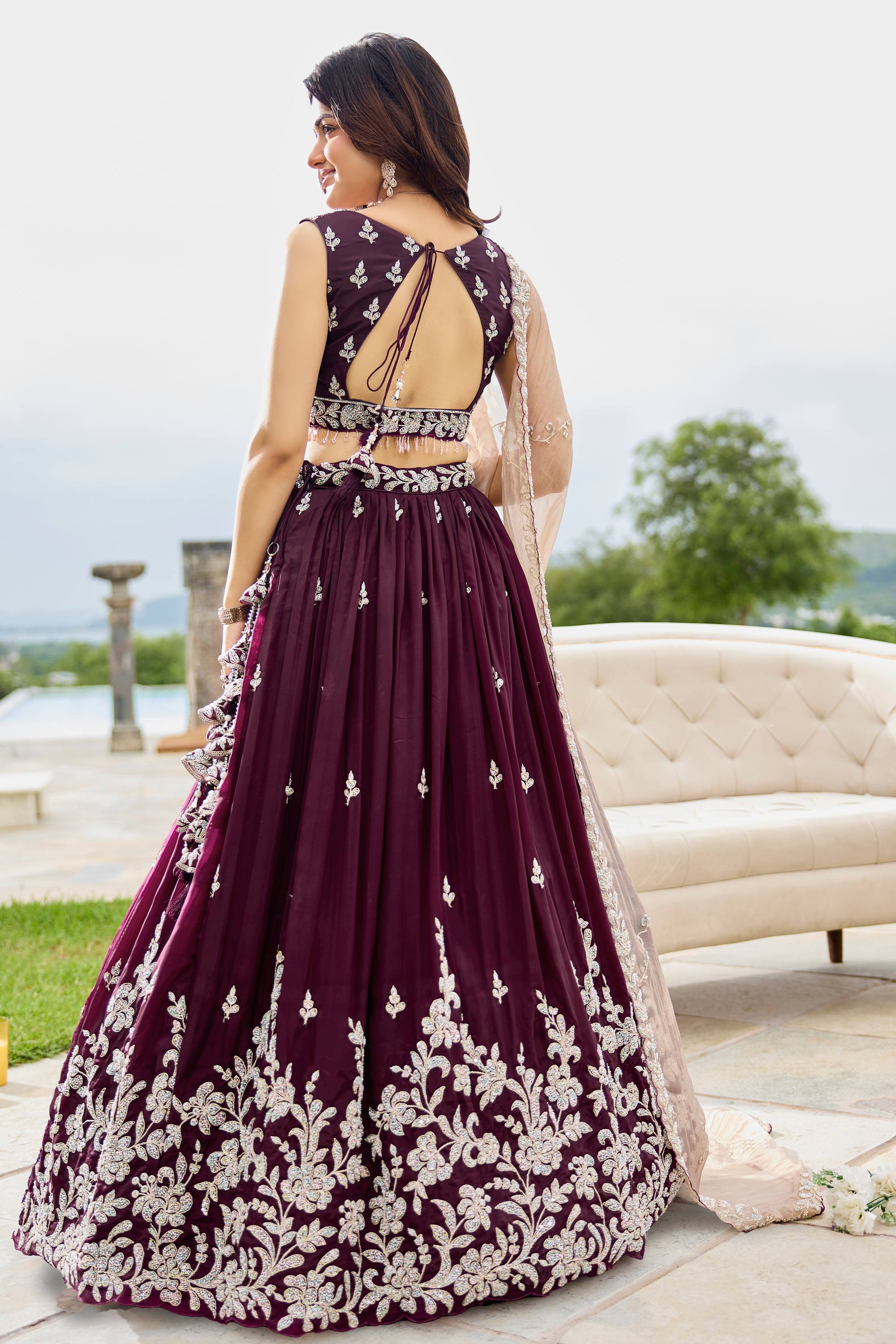 Satin Silk Embroidered Wine Wedding Wear Readymade Lehenga Choli