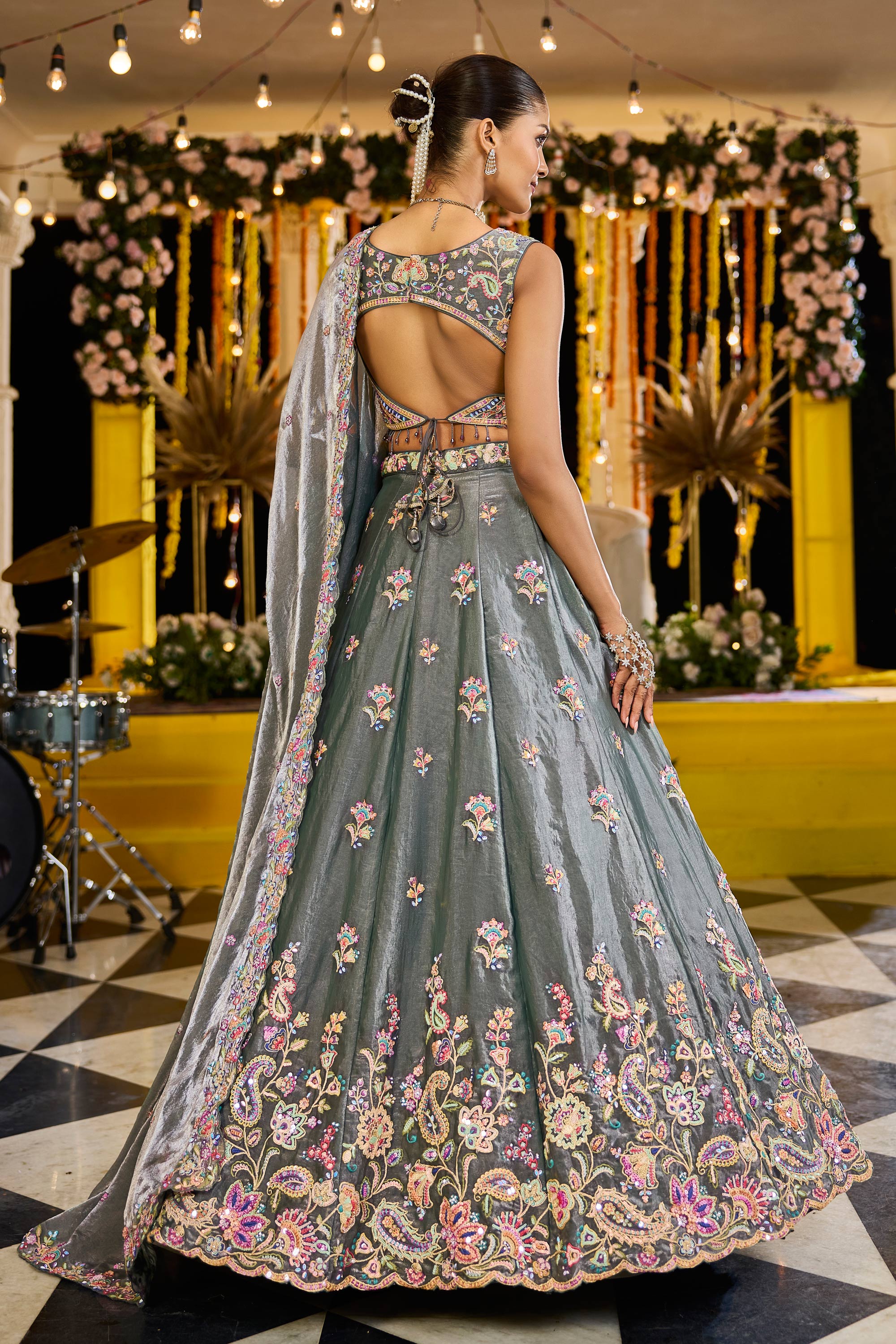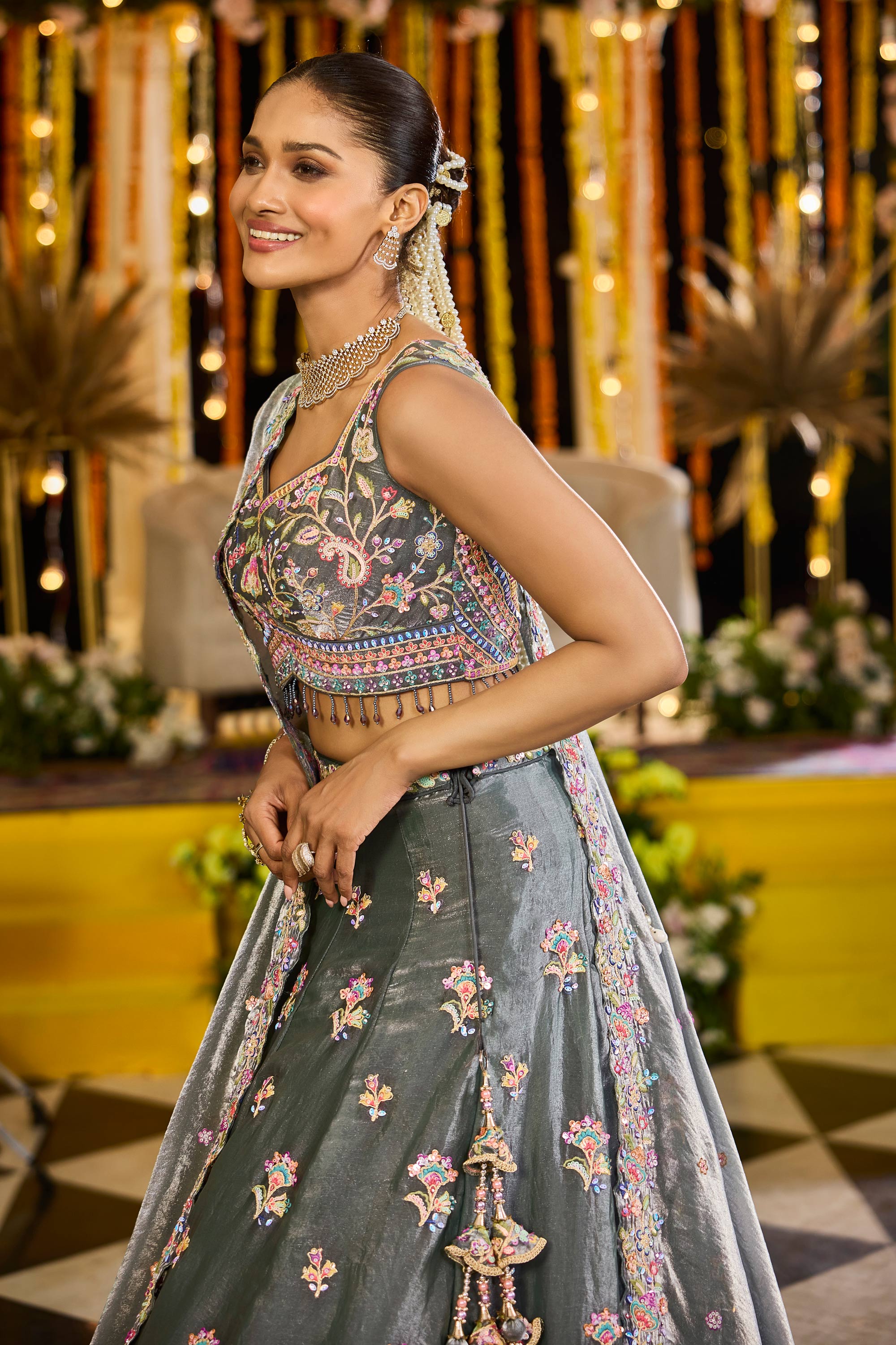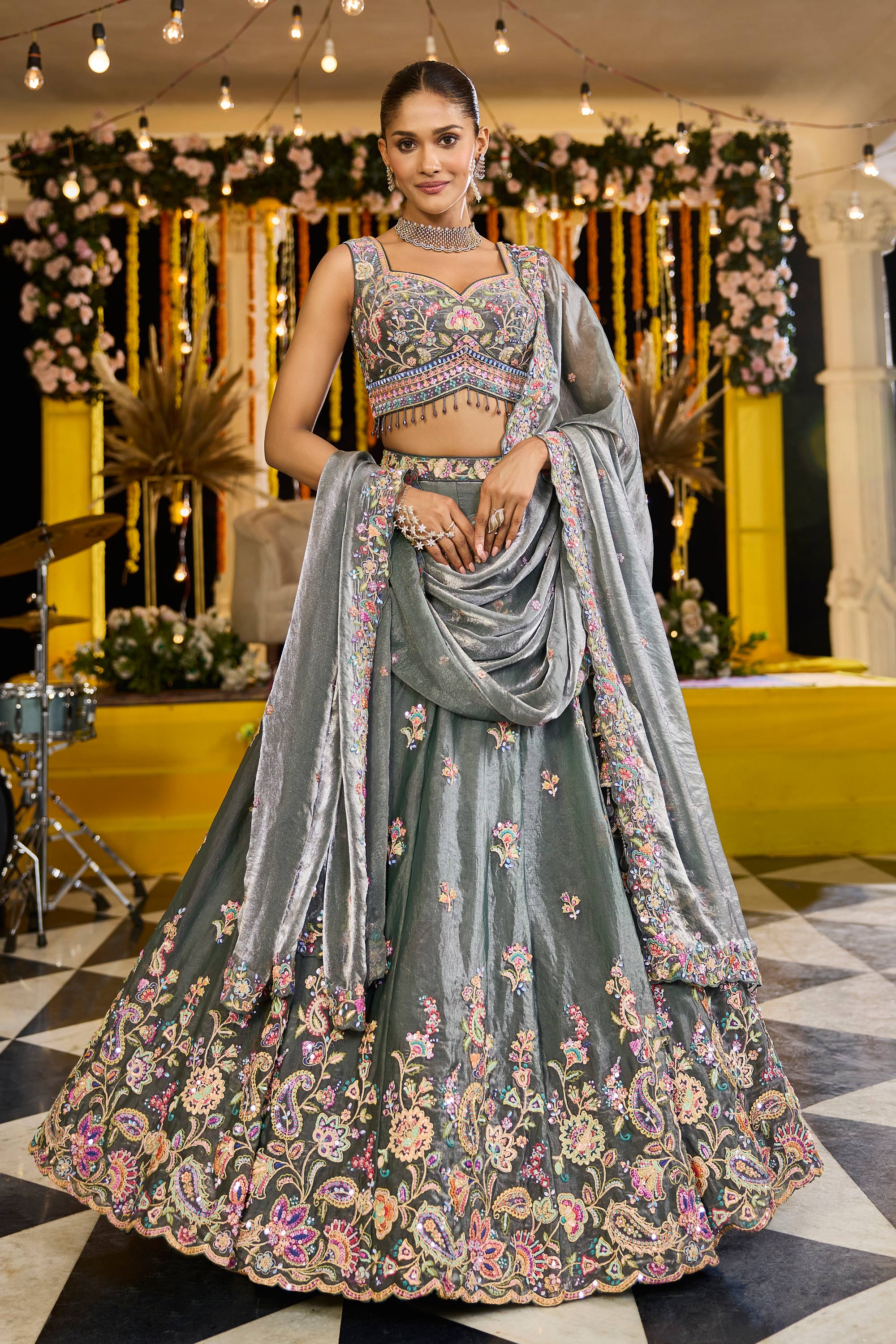 Tissue Embroidered Sea Green Lehenga Choli For Wedding Wear