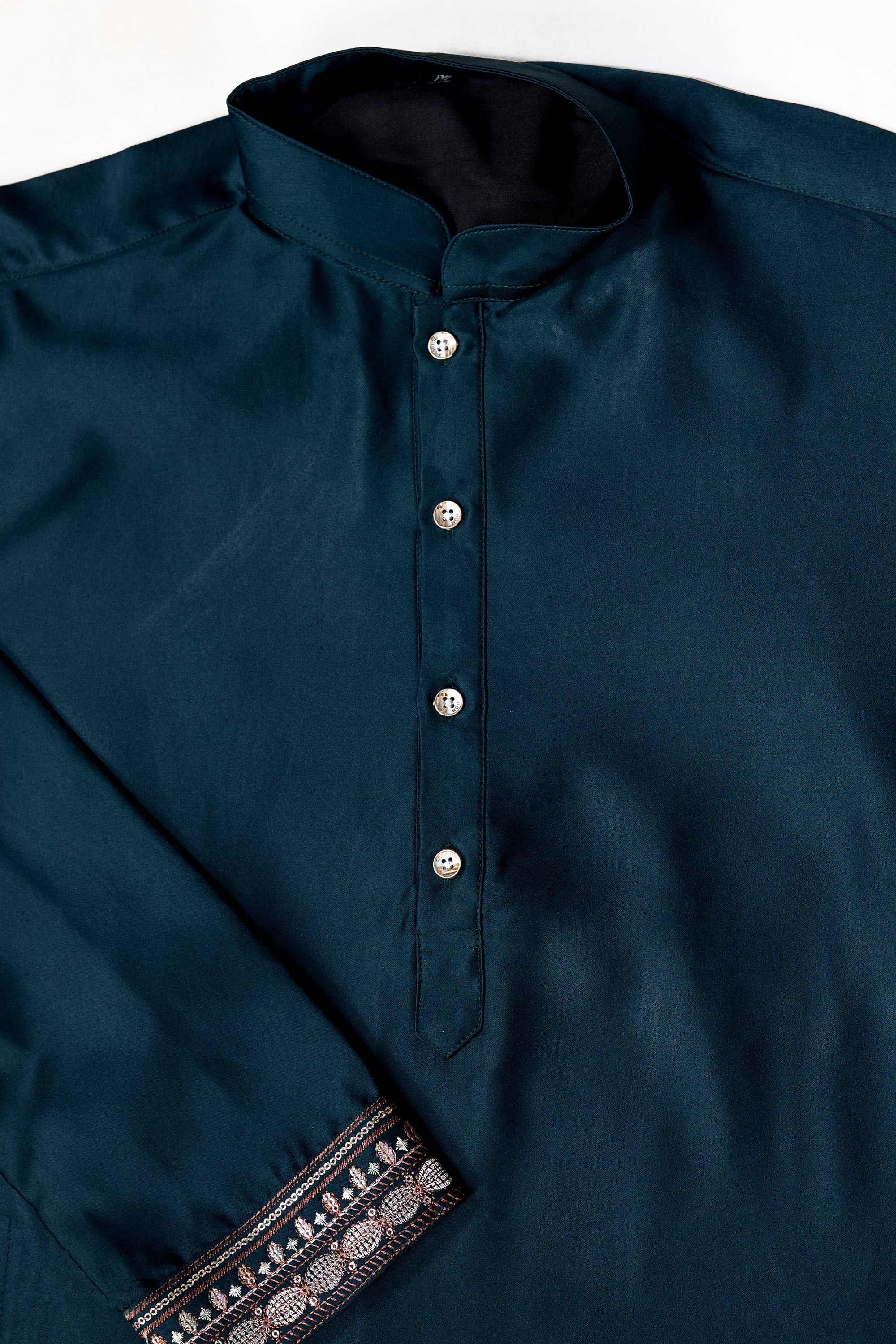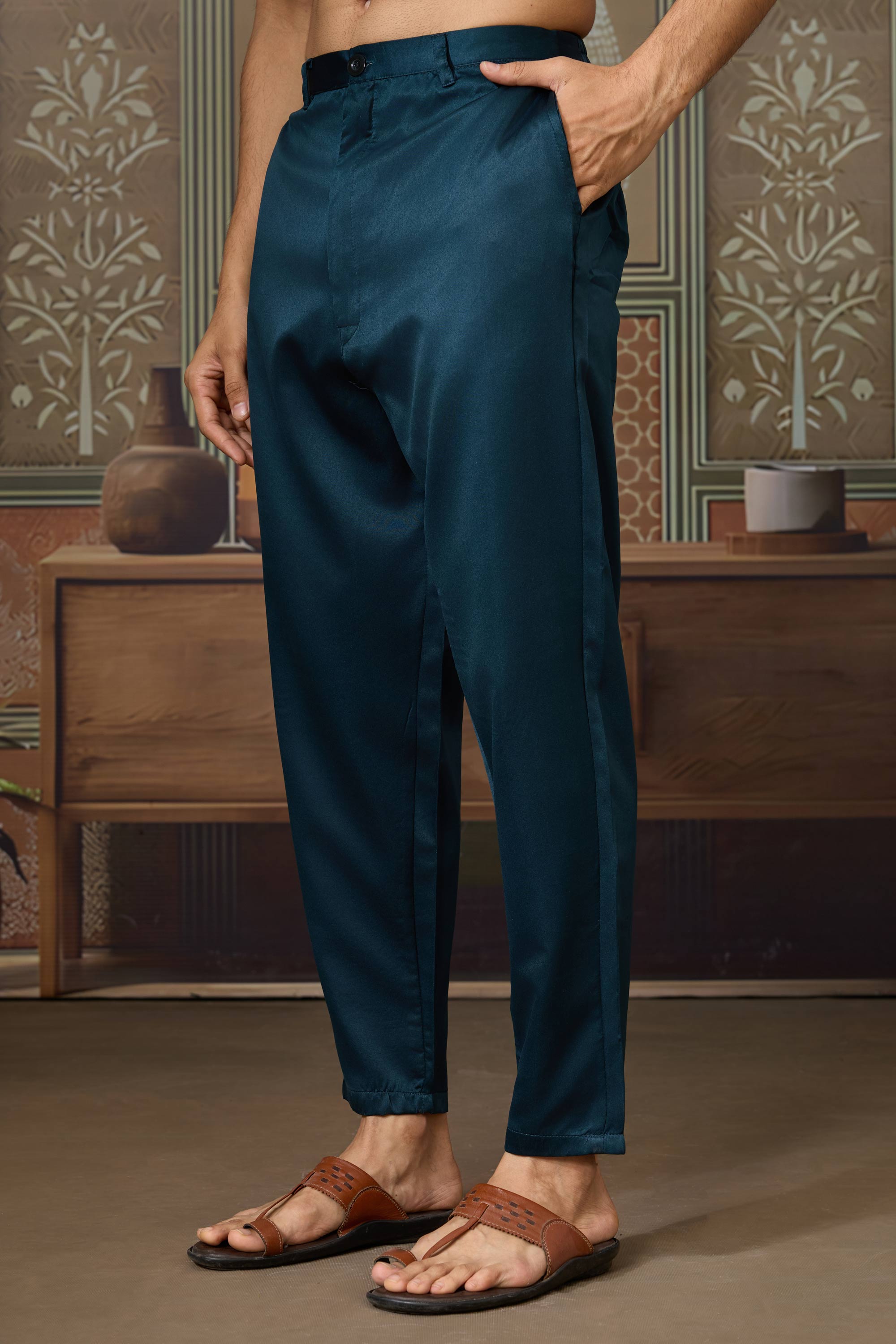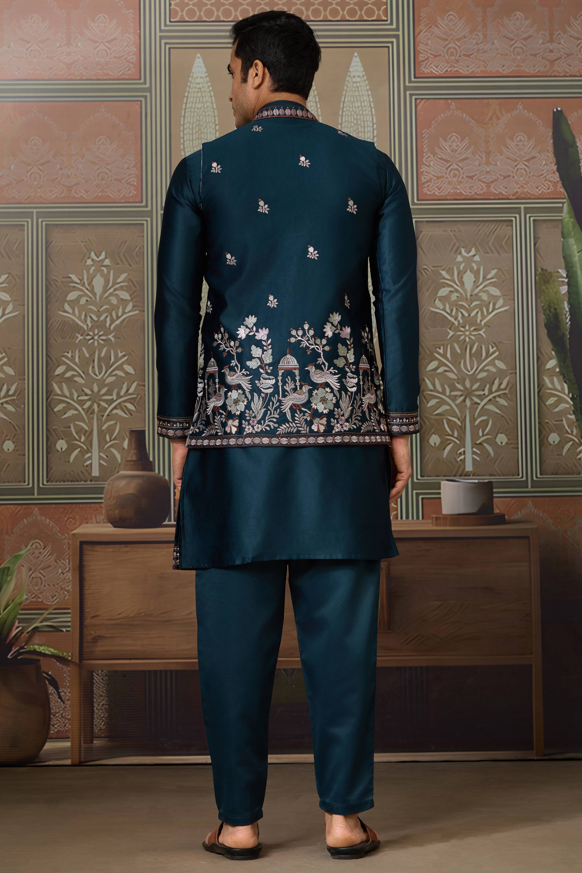Art Silk Teal Readymade Stunning Kurta Pyjama For Men With 3 Pcs Jacket Set
