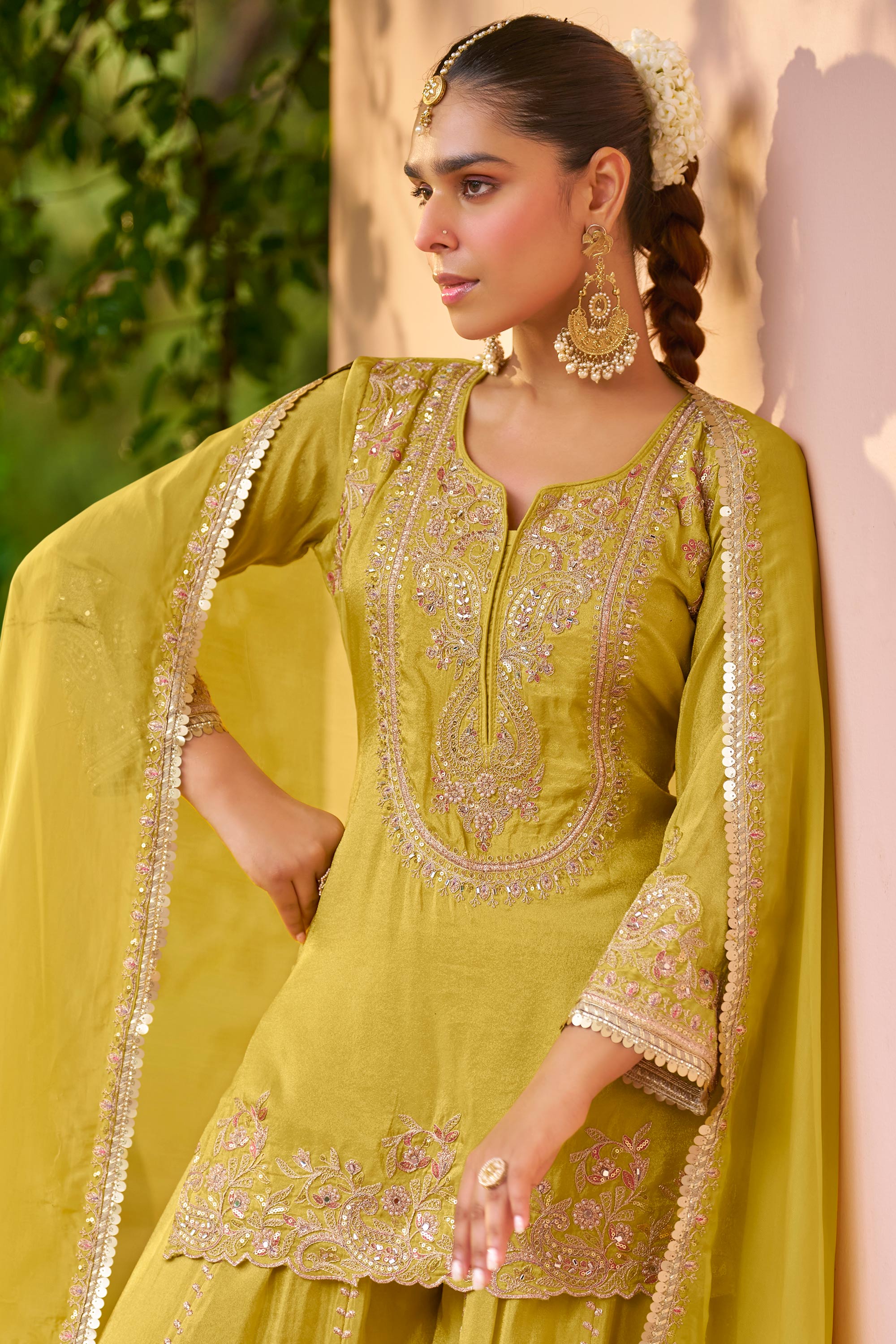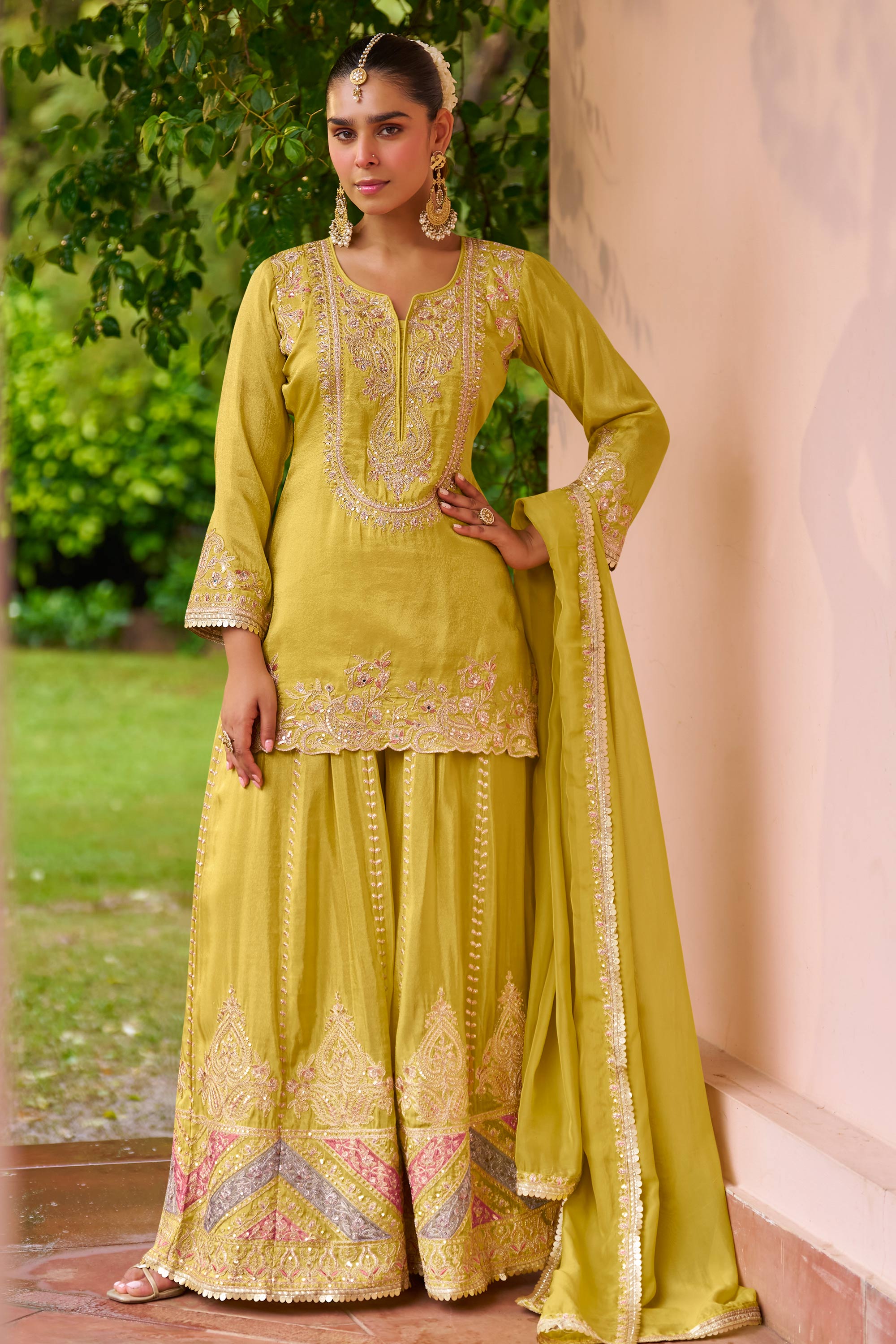 Embroidered Chinon Yellow Function Wear Readymade Palazzo Suit