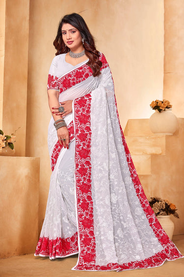 Embroidered Work White Georgette Saree With Pretty Blouse