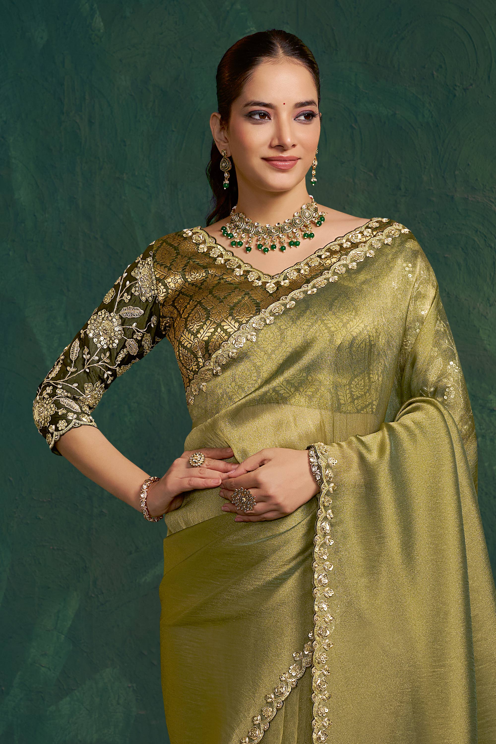 Green Wedding Wear Tissue Silk Embroidered Border Work Saree