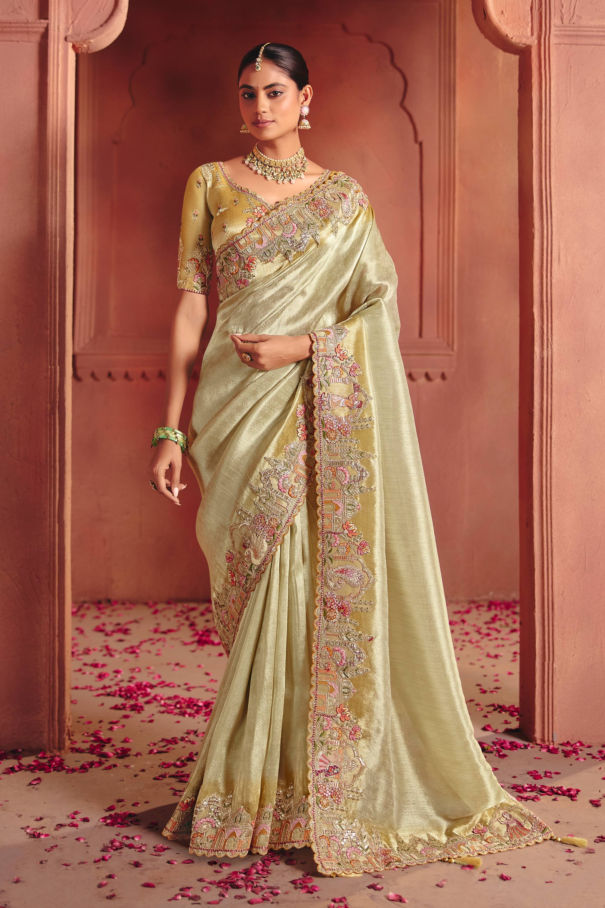 Peach Wedding Wear Silk Fabric Embroidered Saree