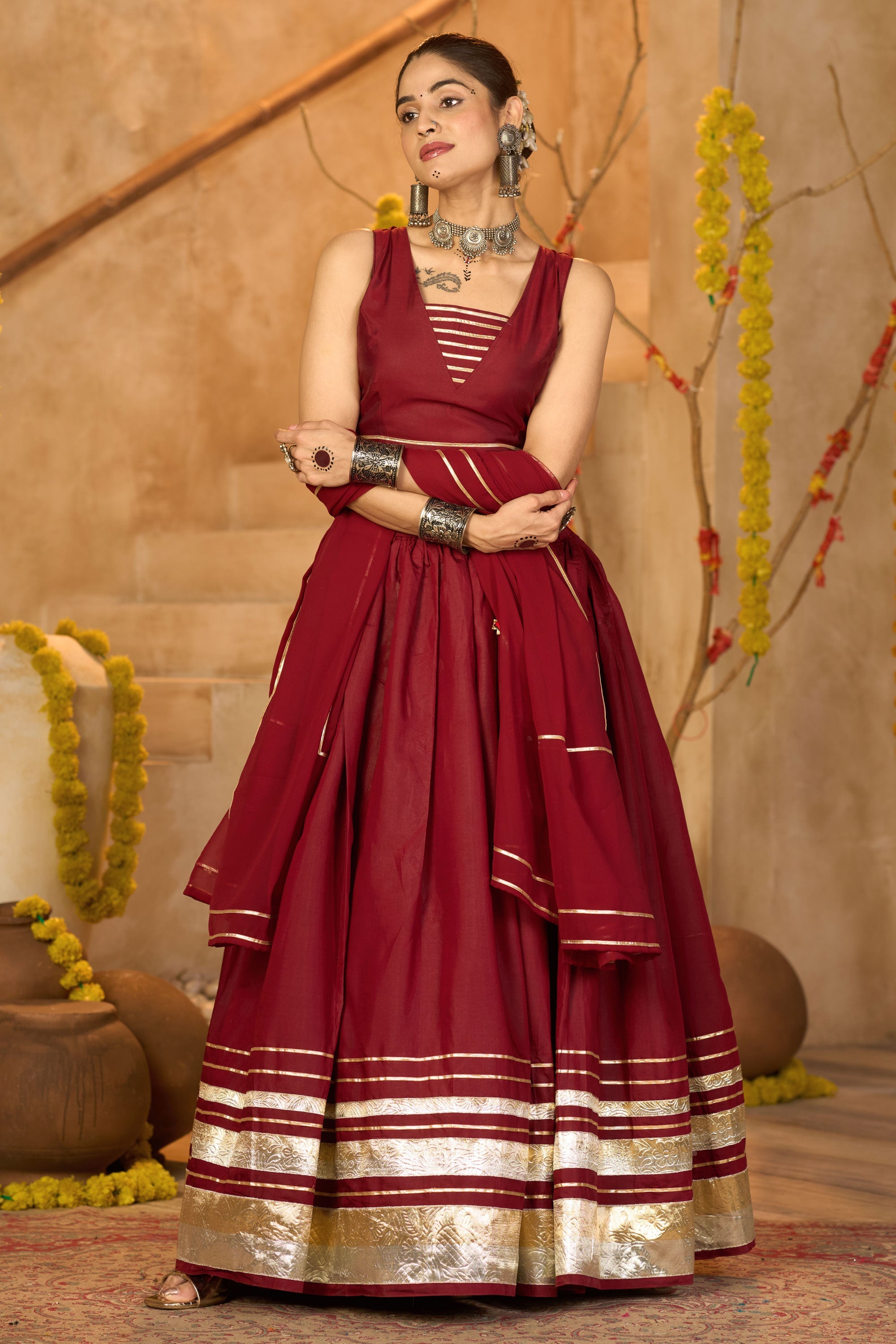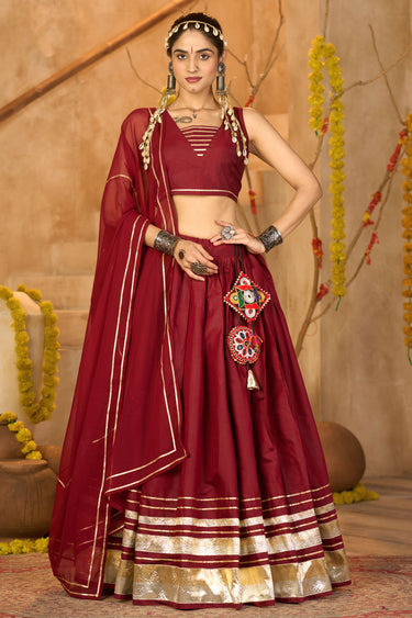 Maroon Silk Mirror Embroidery Lace Work Navratri Lehenga