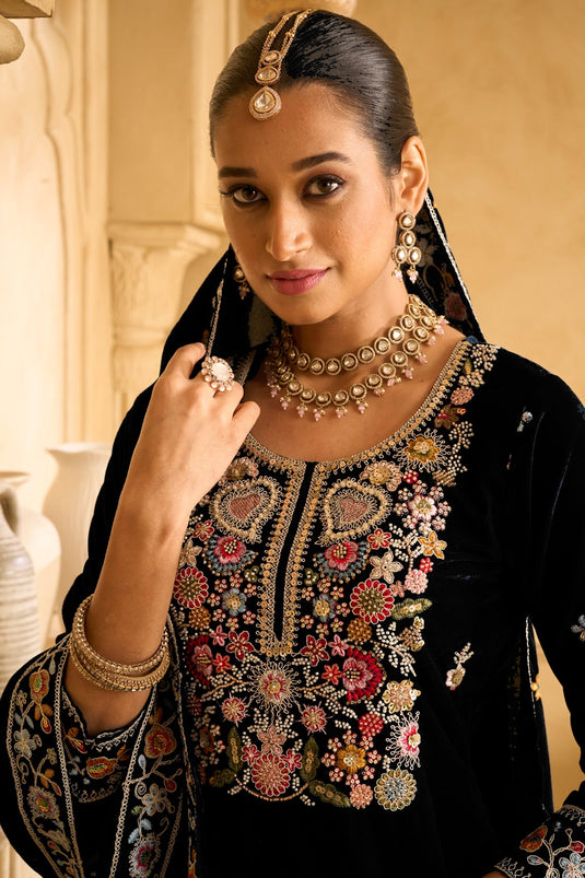€63,95 EUR€126,95 EUR Original Price Save 50%/ Womens Black Embroidered Chinon Silk Readymade Palazzo Suit With DupattaSave 50%