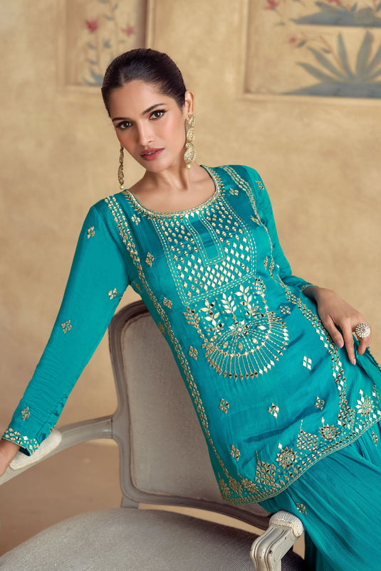 €69,95 EUR€137,95 EUR Original Price Save 49%/ Cyan Chinon Embroidered Readymade Palazzo Salwar KameezSave 50%